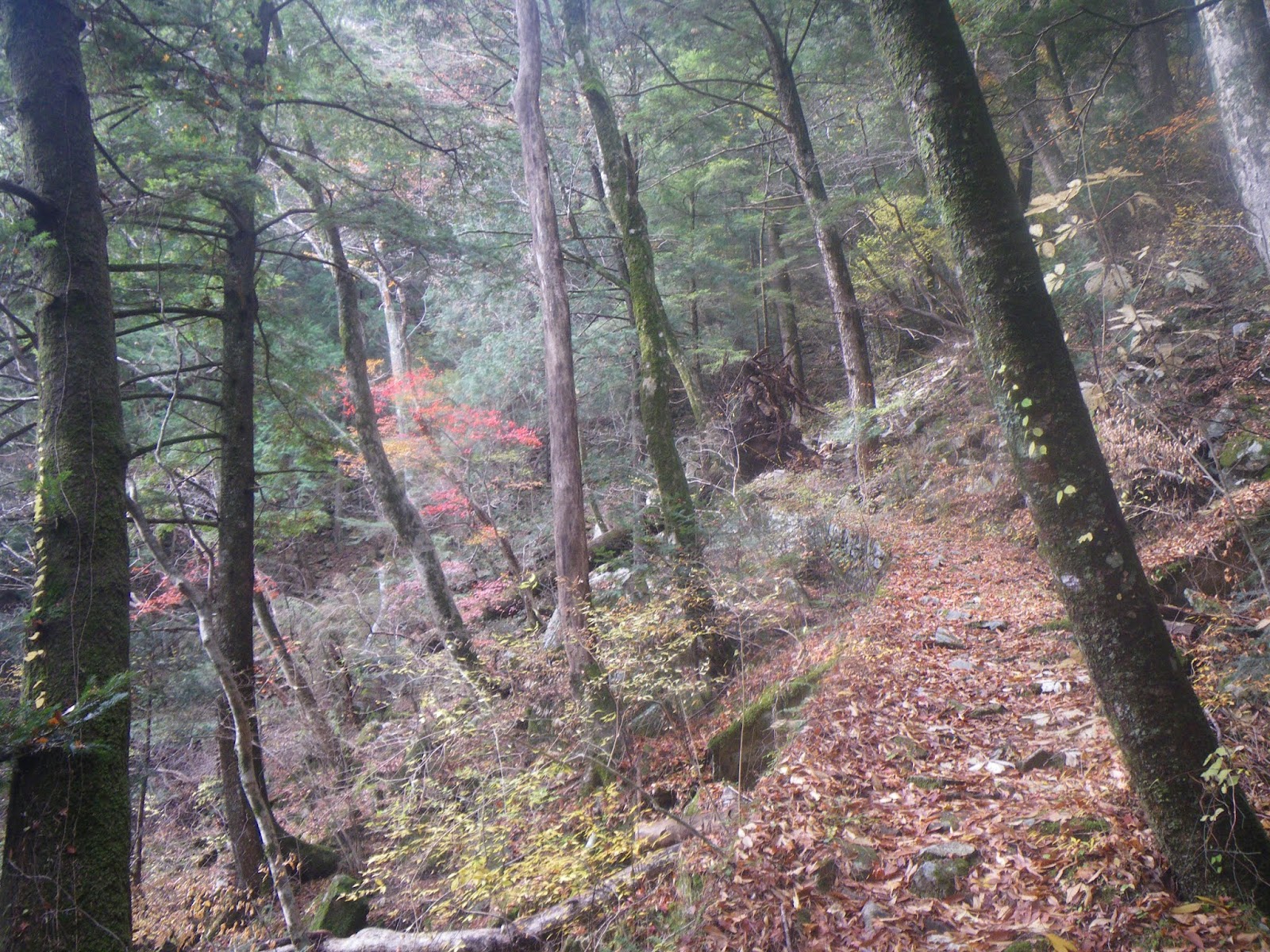 紅葉河原辺りまで引き返し、「パノラマ台」の木標から山道に入る。紅葉の少し残る山道を上ると倒木が道を塞ぐ。お気楽にこのルートに入ったのだが、結構な山道。比高差200mほど上り、面河山から落ち面河川と鉄砲石川を分かつ山稜の尾根道まで引っ張られることになった。