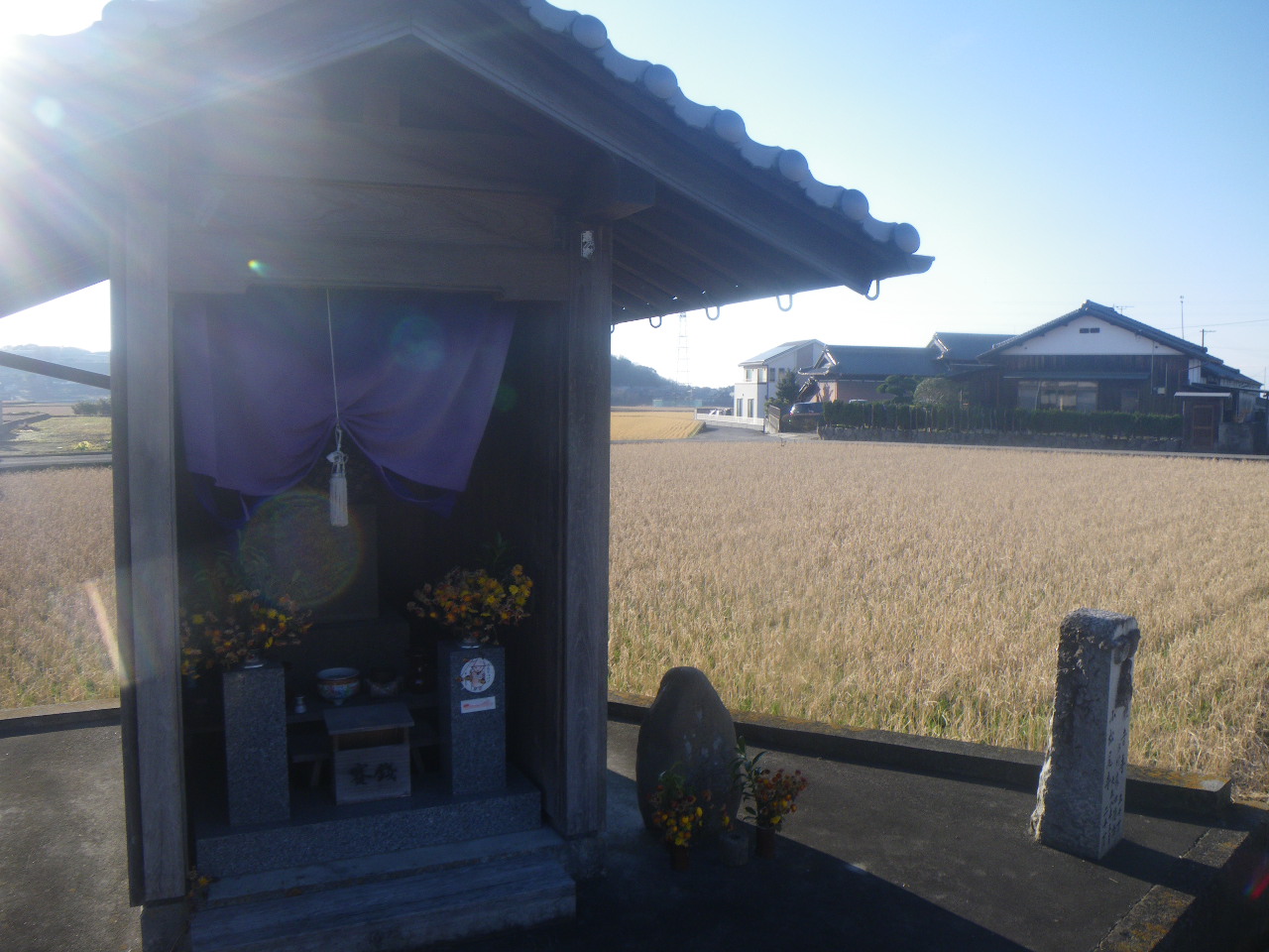 少し小高くなった道を進むと右手の民家の間に道標と大師坐像がある。道標は茂兵衛道標。正面に「左いよ道 小松尾道」、裏面に「左 小松尾道」、側面に手印と「壱百度目供養」などの文字が刻まれる。遍路道は側面の手印に従い、旧国道から右に折れ民家の間を抜ける細路に入る。