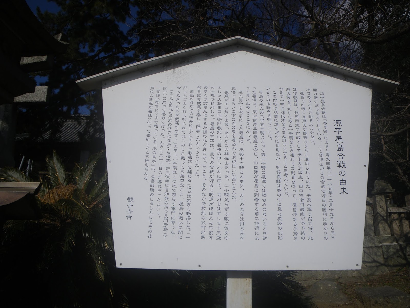 山裾の境内も広い。駐車場を兼た境内には参集殿、神幸殿や摂社、忠魂碑、源氏との深いつながりを示す源平屋島合戦の案内などもあった。