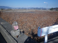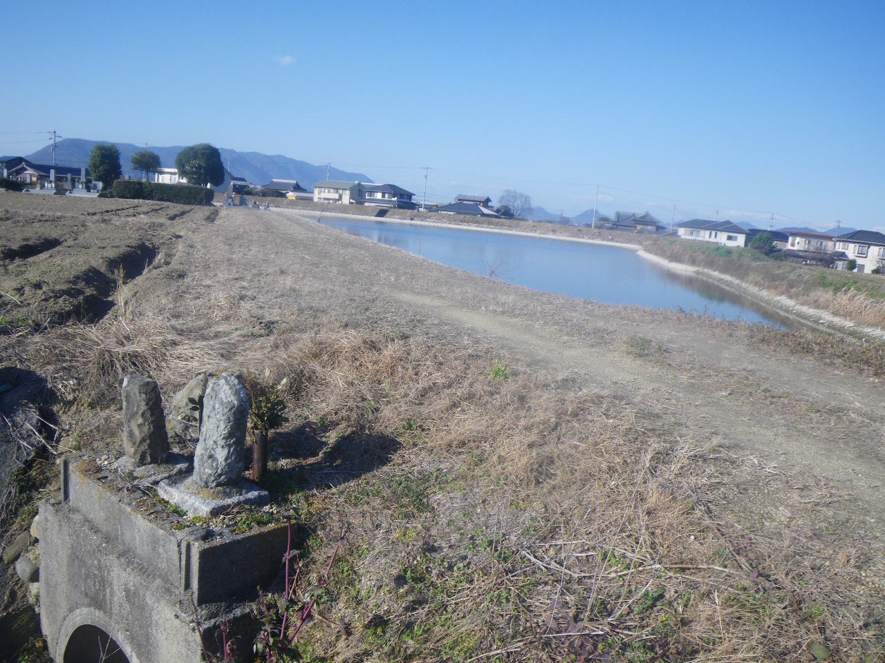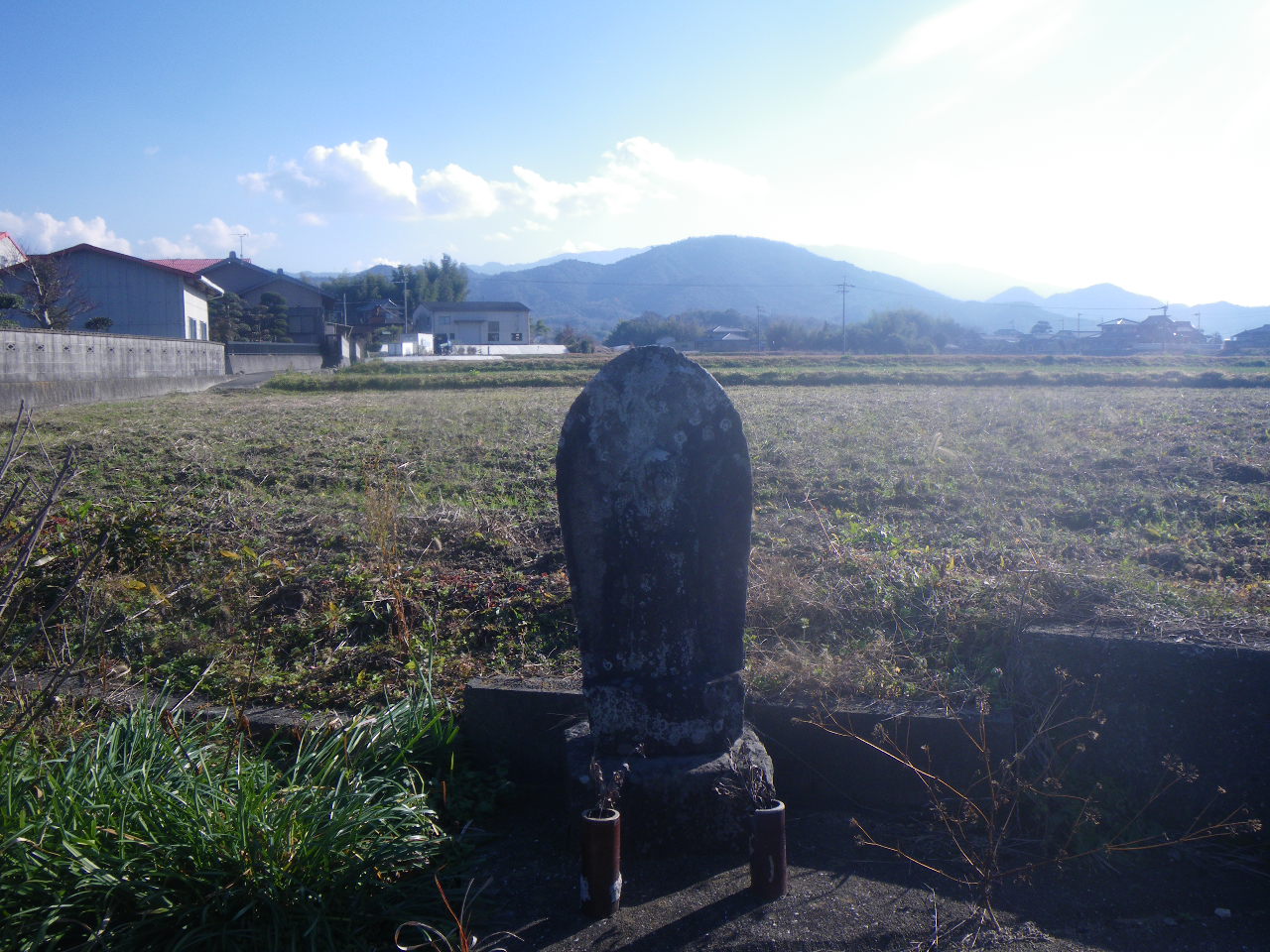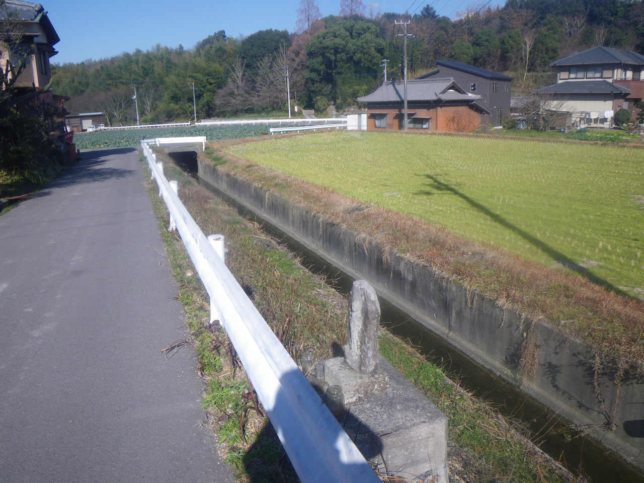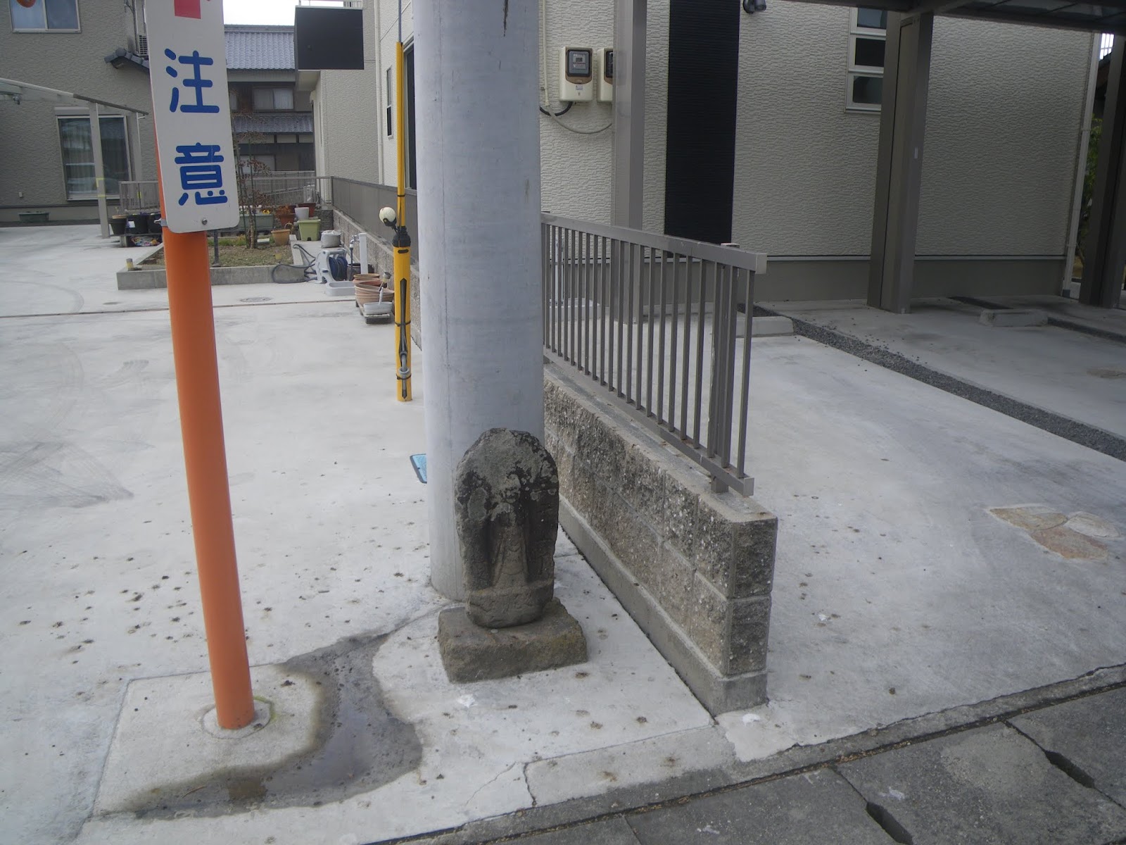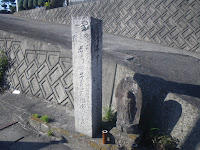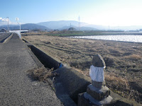 大興寺を離れ、極楽橋の架かる水路に沿って北に進む。舗装された農道といった道である。道が水路の左岸に渡る手前のT字路角に舟形地蔵丁石が立つ。摩耗が激しく文字は読めない。