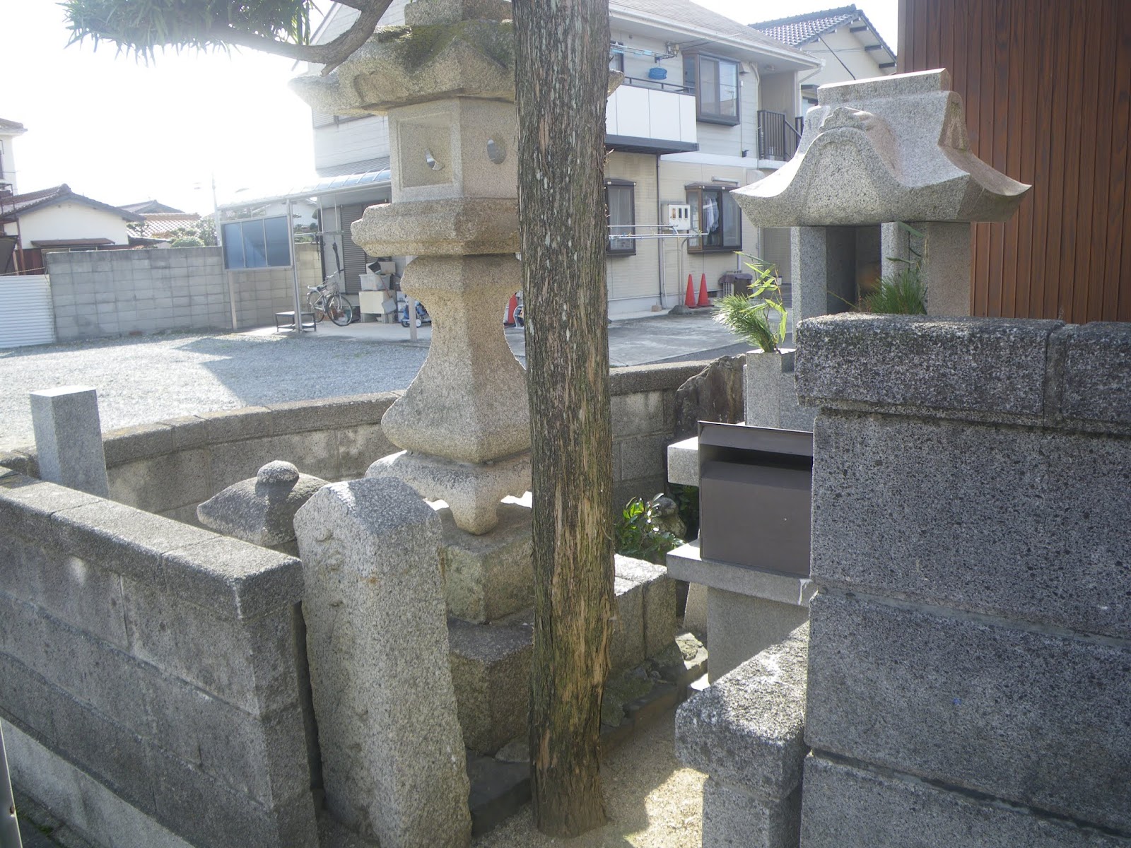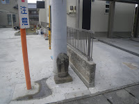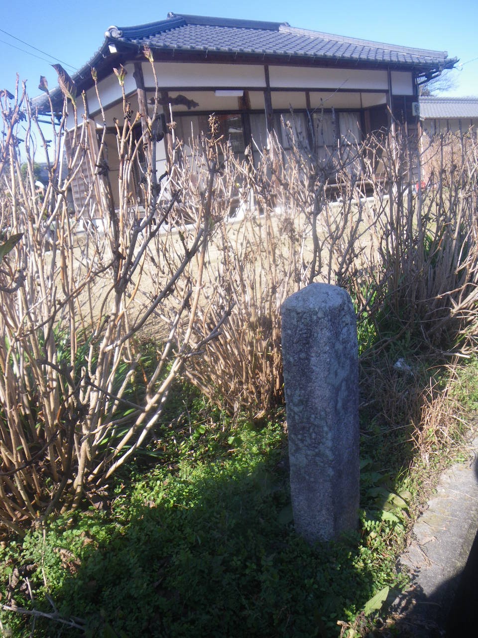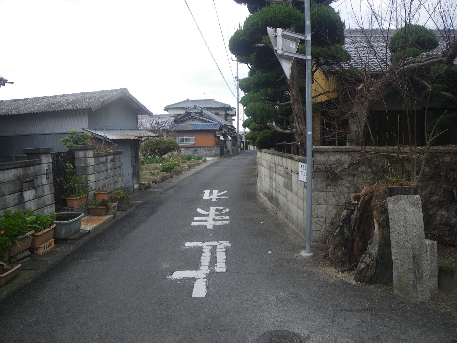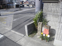 道の左手に金神神社の社叢。道が金神神社へと左折する角、民家の生垣に2基の石柱。その小さなほうが真念道標。手印と共に「へん路みち 願主真念」と刻まれる。