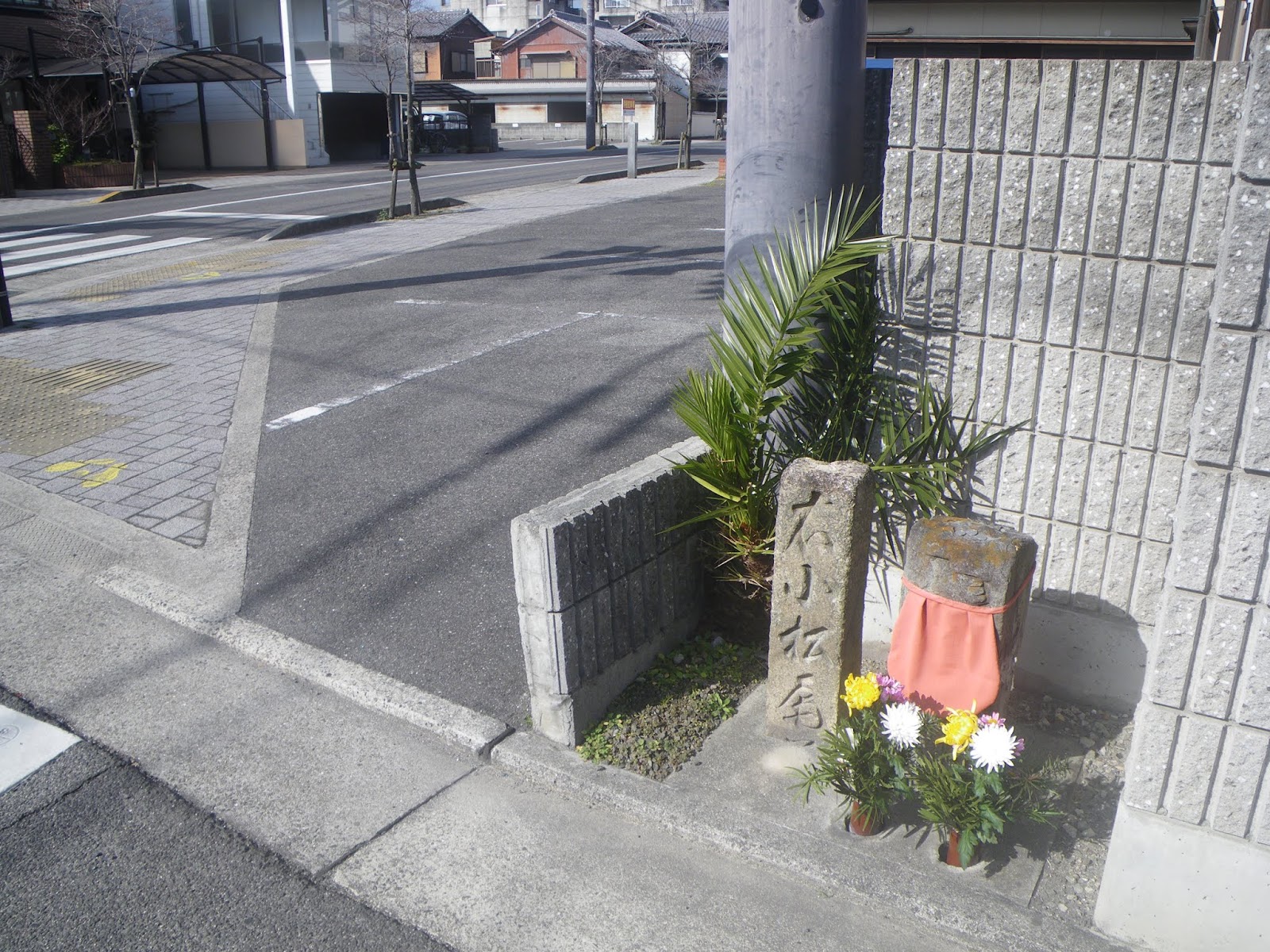 道を左に折れ県道6号を進むと池之尻交差点。その西南角、低いコンクリートでブロックされた一角に道標が立つ。「くあんおんじ道四十丁 小松尾道三十丁」と刻まれる。かつてはこのブロック内に金毘羅道標など石塔が集められていたとのことだが、今はすべて撤去されていた。