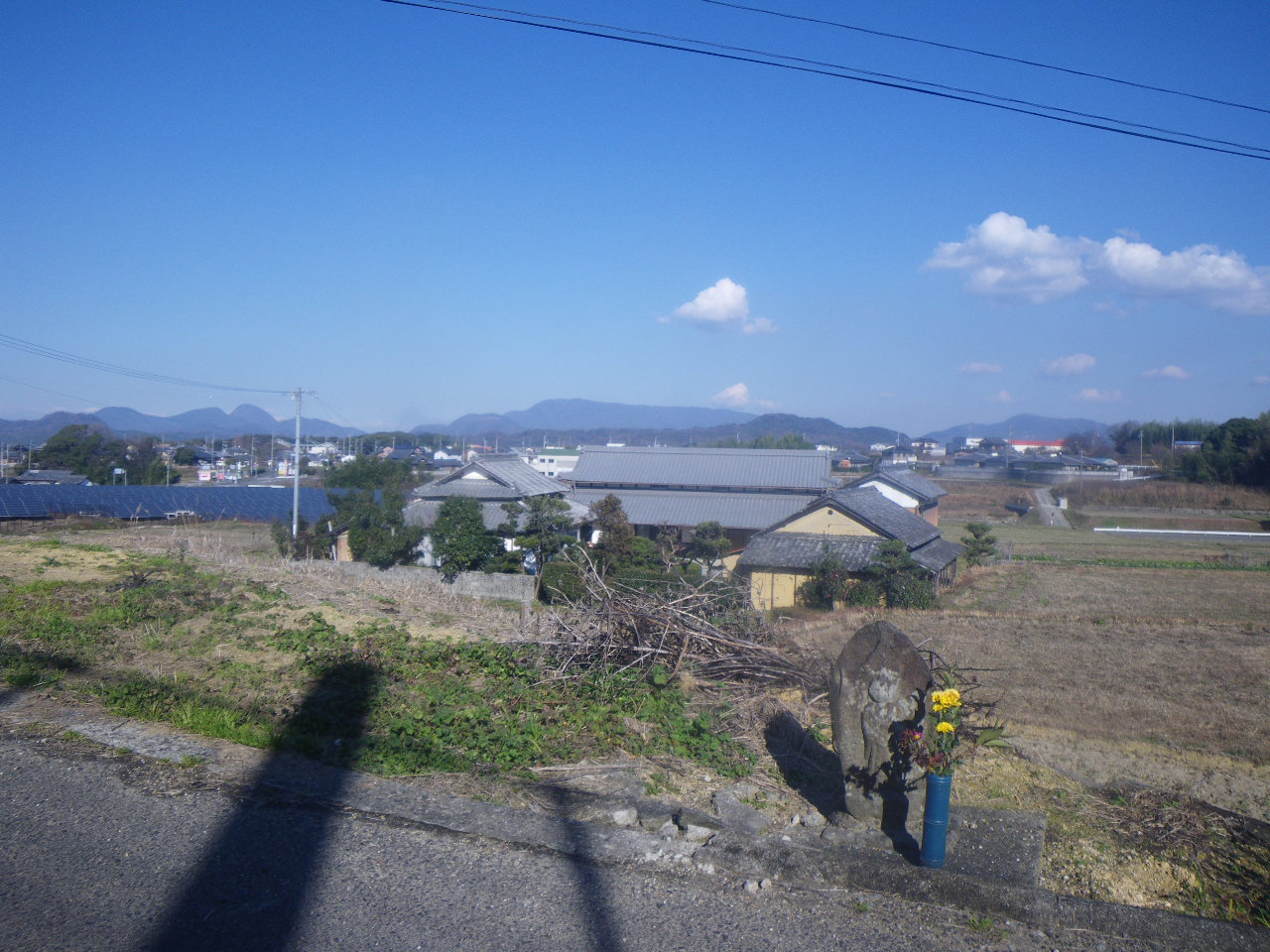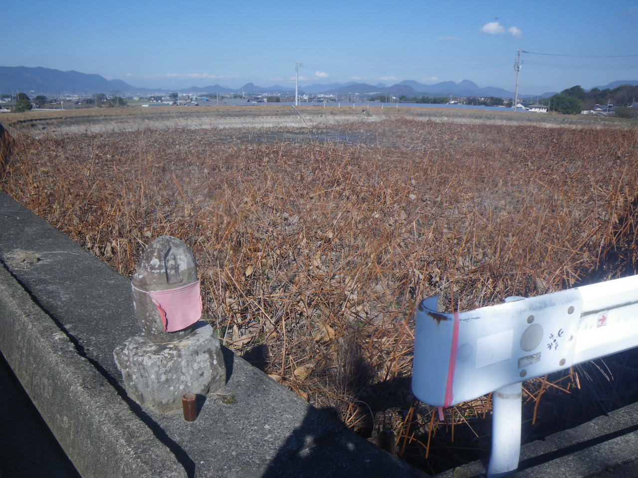 国道を少し東に進むと、道の左手に九丁地蔵標石が立つ。阿讃山脈を借景になかなかいい眺めだ。標石には「九丁 明香四丁辛」と刻まれる、と。手には錫杖を持つ。