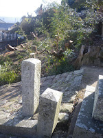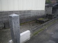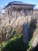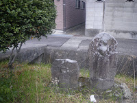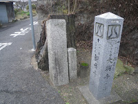 道なりに左に折れ溜池の土手下の草叢に3基の標石。三丁の標石2基と四丁標石。1基はすぐにわかるのだが、その他の2基は草に隠れて、見逃しやすい。