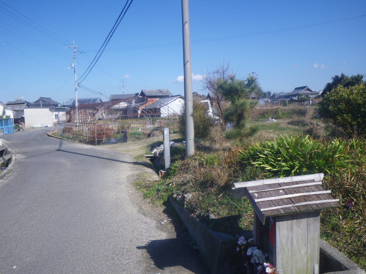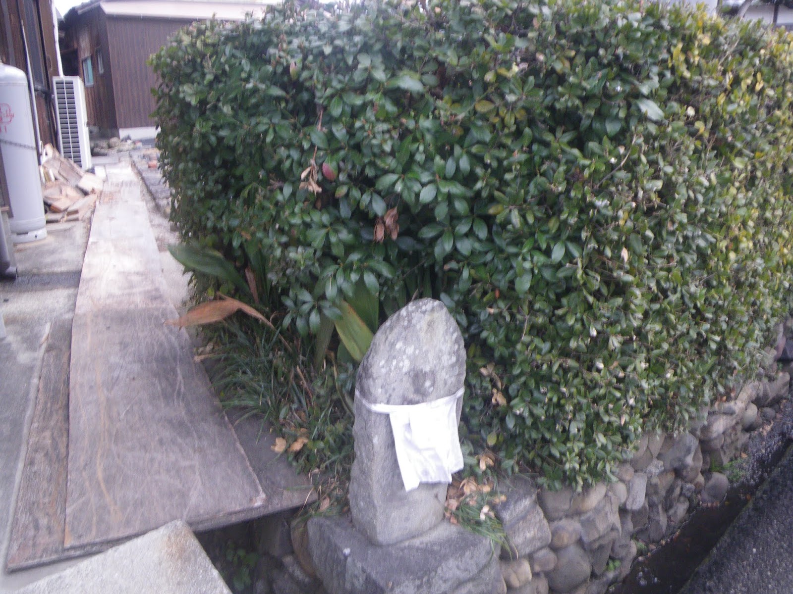 道を進み比較的大きな道と交差する手前、道の左手に地神の石祠があり、そこに2基の道標が置かれている。