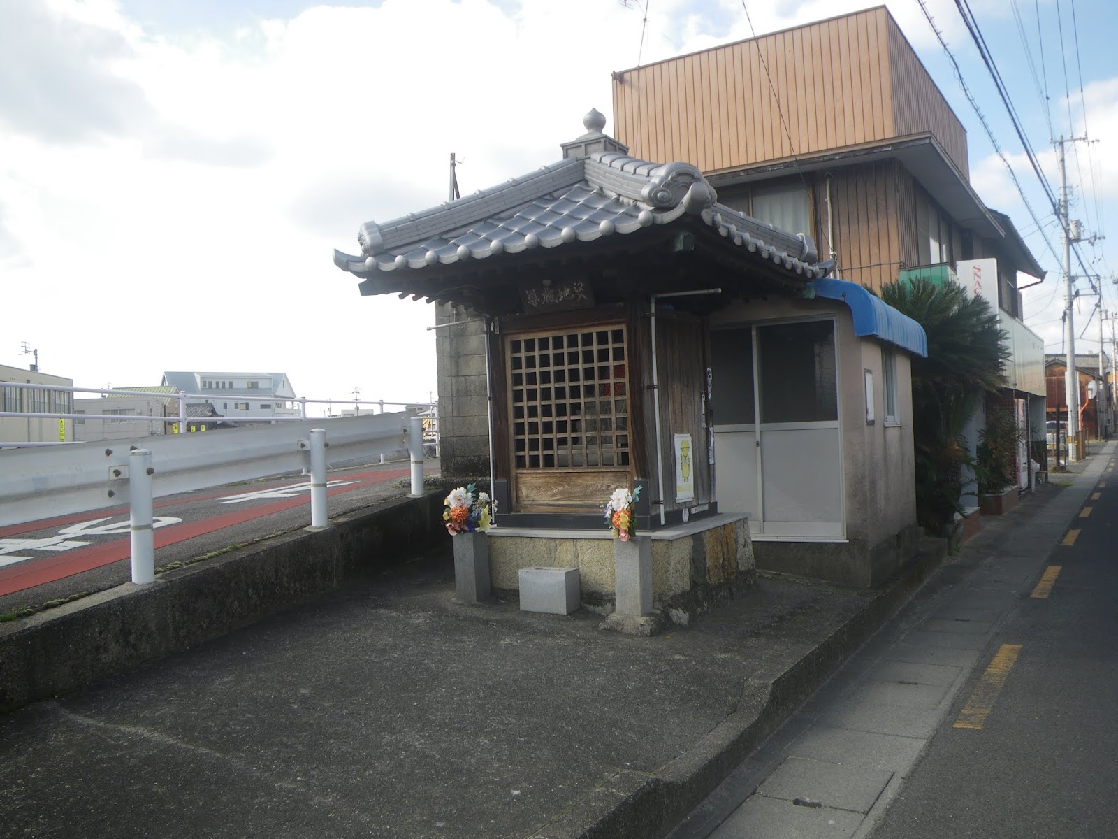 明治橋を渡るとすぐ、道は左右に分かれるが、左へ進む道の左手に汐入地蔵尊を祀るお堂がある。遍路道はこのお堂の前を進むことになる。