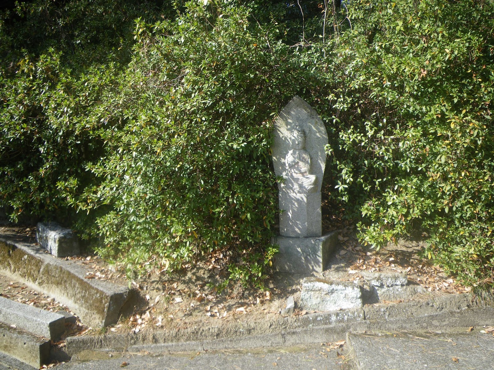 道を少し進むと柏木神社手前の四つ角、民家の塀に埋め込まれたような舟形地蔵が立つ。錫杖を右肩に乗せたお姿である。遍路道はこの辻を左に折れる。