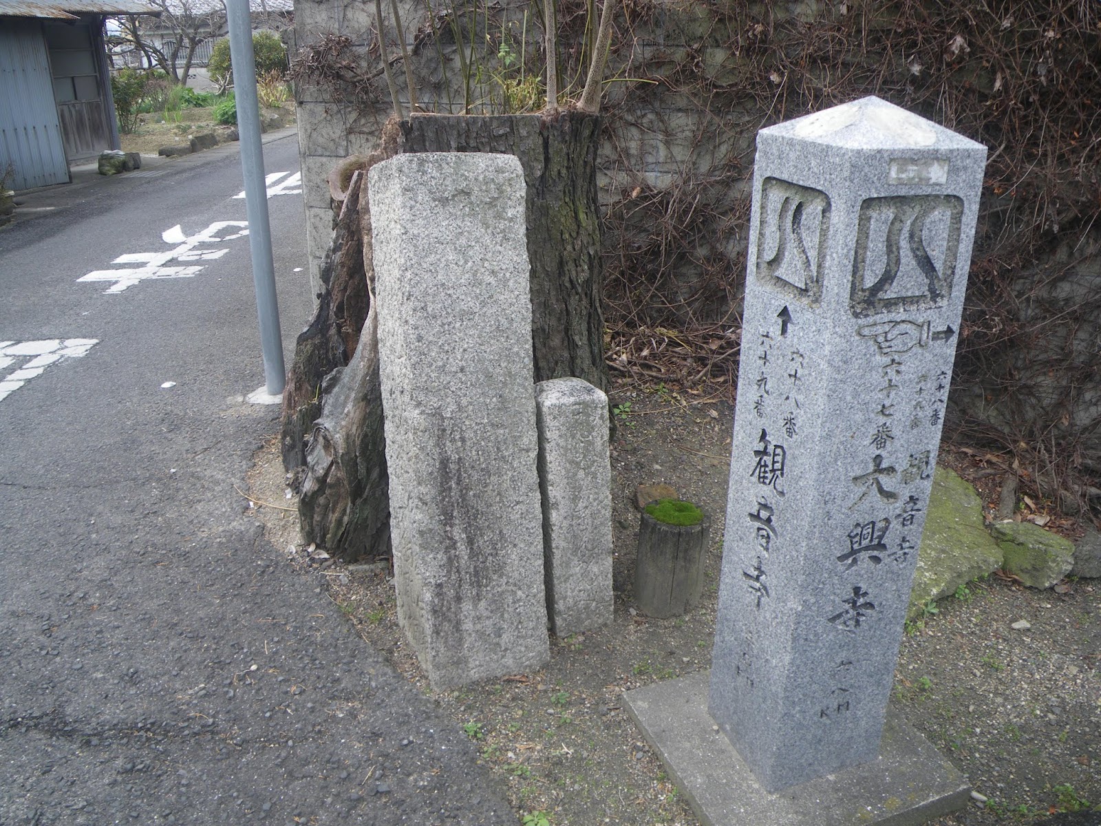 大通寺西の四つ角を越え少し西に進むとお堂があり、山界万霊碑が祀られる。そのお堂脇に標石が立つ。「観音寺五十丁 小松尾寺二十丁 大正八年」とある。正面は修繕され文字は見やすくなっている。