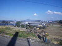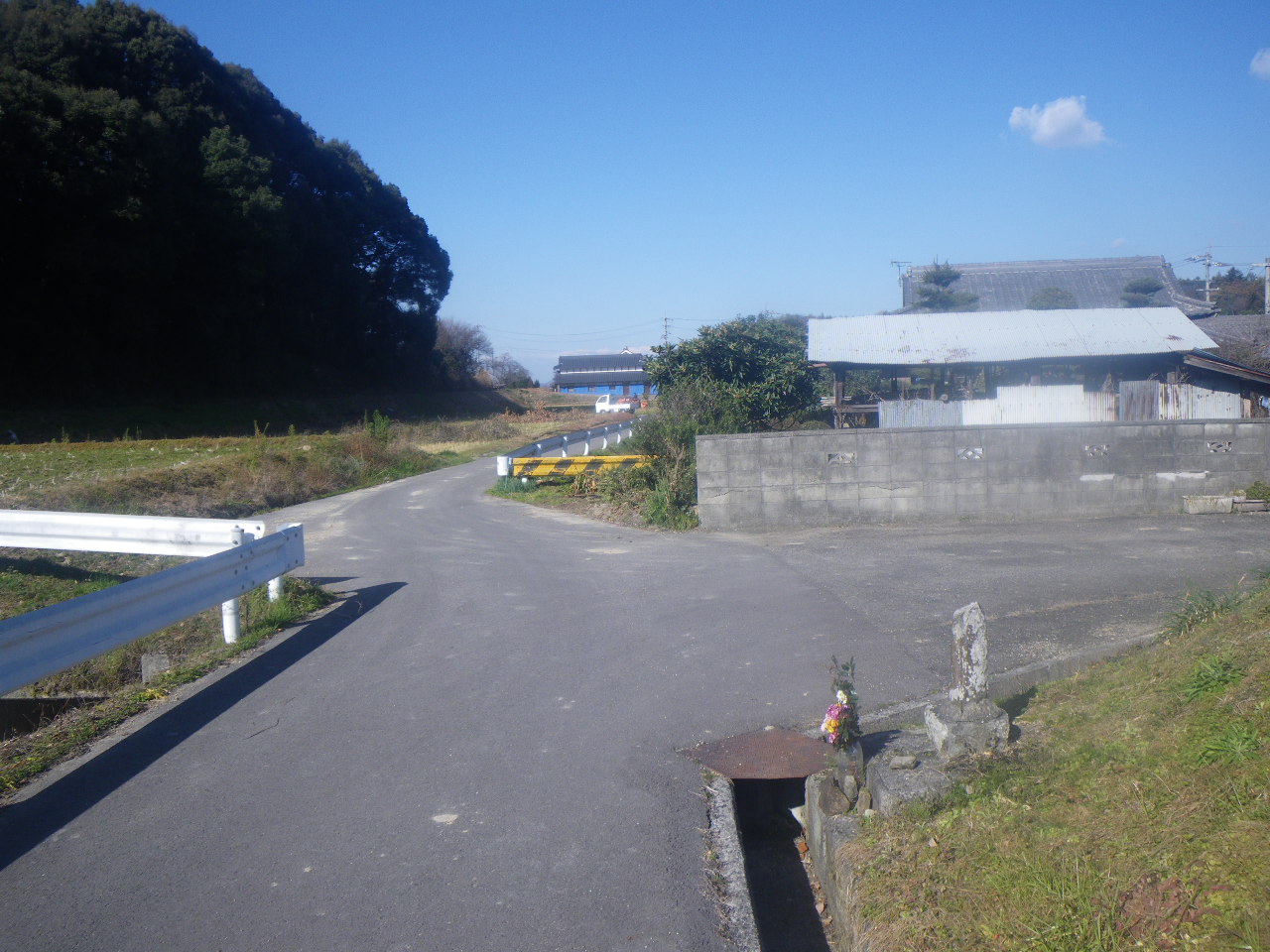 民家の間の細路を犬に吼えられながら進むと国道377号に出る。遍路道は国道を突き切り、畑の畦道といった土径を進む。遍路標識も何もない。偶々地元の方が畑作業をしており、お話をすると国道建設に際し標石が移された、と。