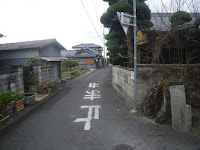 妙見道とは?はるか離れた宅間の地に妙見山に妙見宮が鎮座するが、そこではないだろう。かつて、琴弾八幡の参道途中から観音寺へと抜ける道があったようであり、その途中の産巣日(むすび)神社・妙見社でもあったのだろか。標石の記す二丁は観音寺までの距離かもしれない。妙見道へと少し入ったが進めそうもなく元に戻った。
