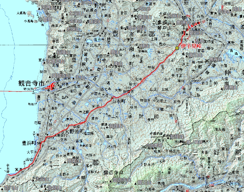 国道377号は、大野原白坂あたりから、三豊市と仲多度郡まんのう町の境にある伊予見峠を越え牛屋口に至る金毘羅道筋とほぼ重なる。ために金毘羅街道とも称される。
