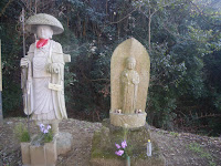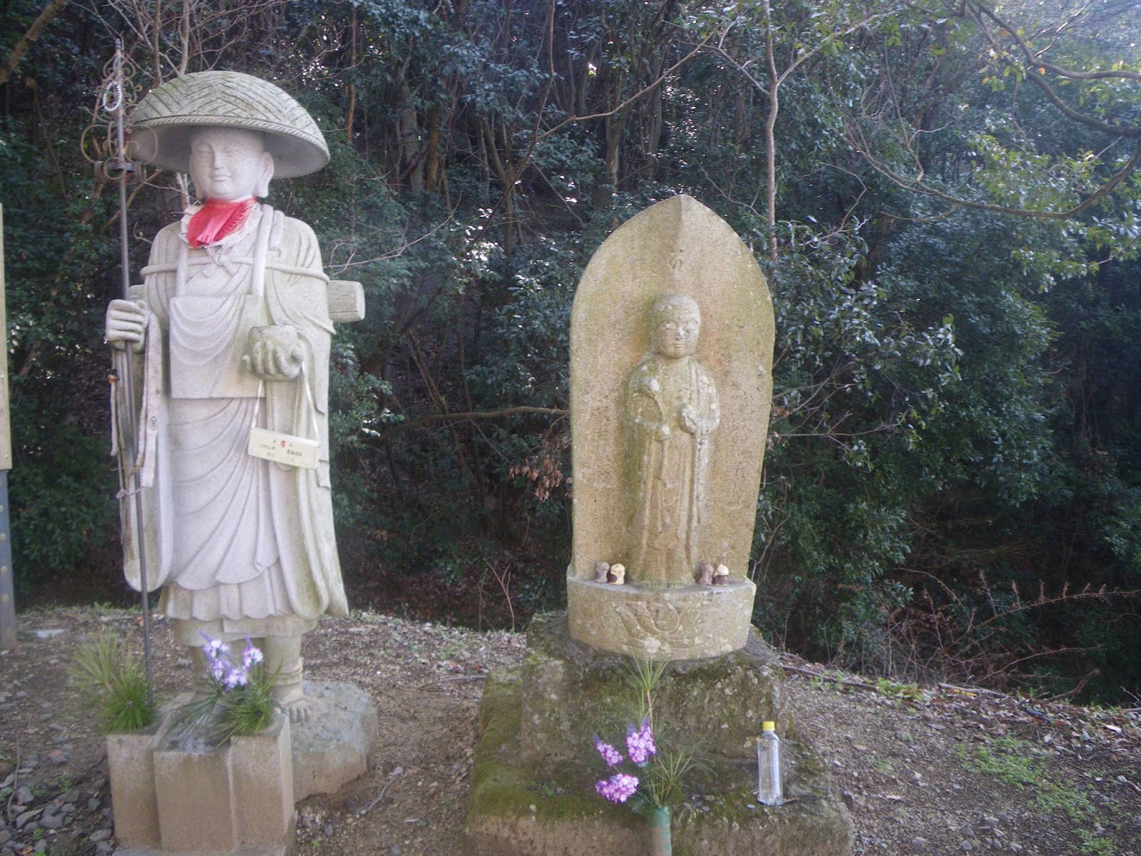 分岐点の標石に従い左手の道に入ると、標石脇に高い柱碑、大師座像、壊れた屋根石下の石造物がある。墓石らしにものも見える。