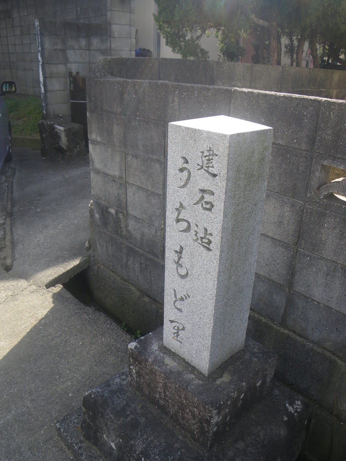 さらに少し進むと大津池に出る。その西南隅、民家のブロック塀の前に「四国のみち」の標識、自然石の標石、そして茂兵衛道標が立つ。