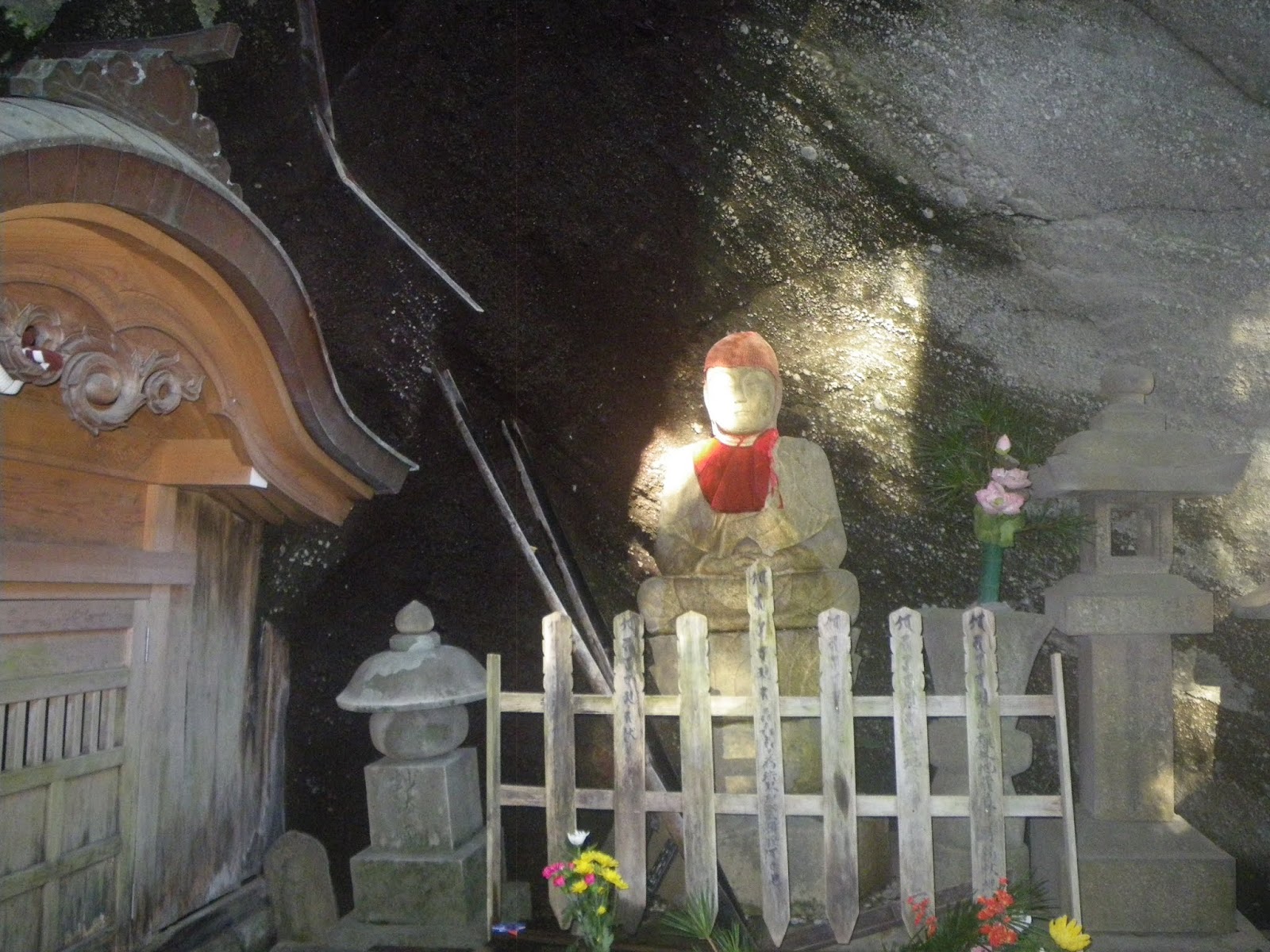 岩壁に行者姿の石像。雨乞いの祈祷するも、その霊験無きを恥じ焼身往生をした行者様と言う。