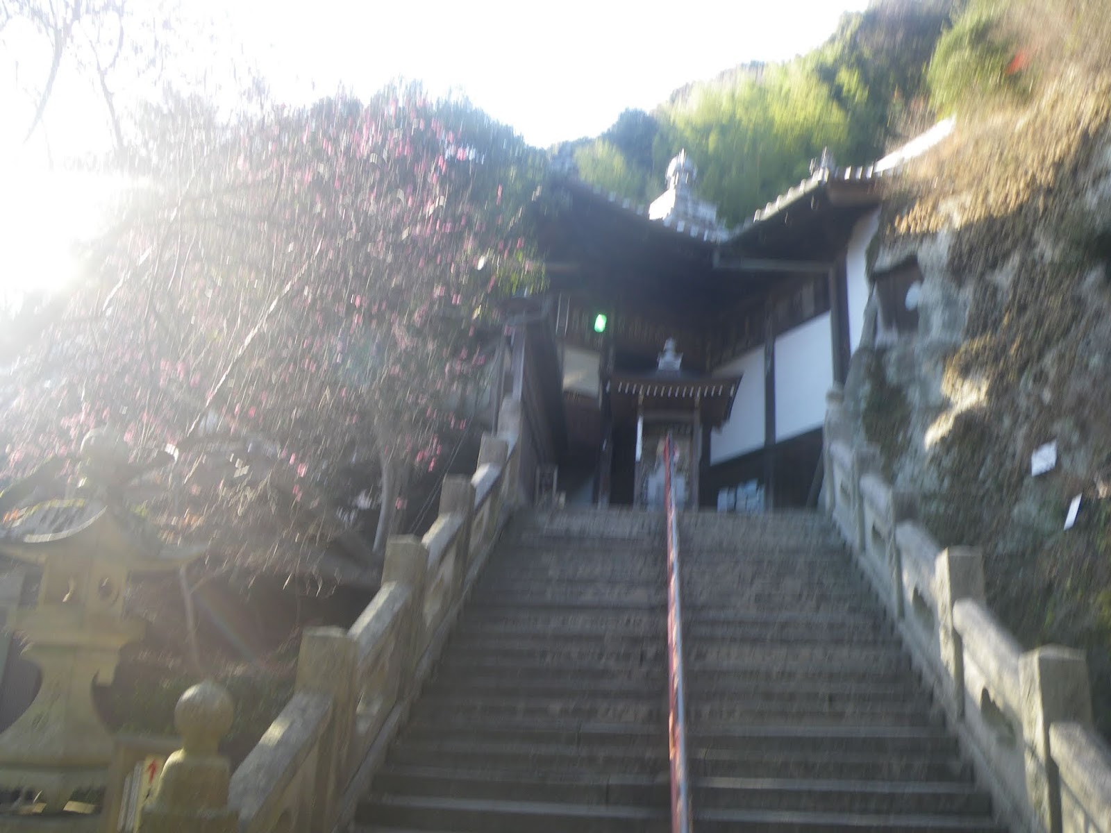 駐車場を上がり、参詣のシャトルバス乗り場のある広場に出る。山腹の本堂まで640段余の石段があるようで、途中までシャトルを利用される団体お遍路さんが目についた。