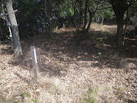 遍路道分岐点に立つ舟形地蔵にお参りし、尾根道を進む。5分ほど歩くと隠砦跡の標識。城への道を土塁で隠している、といった記事もあるが、門外漢には土塁と自然地形の区別がつくわけもなく、先に進む。