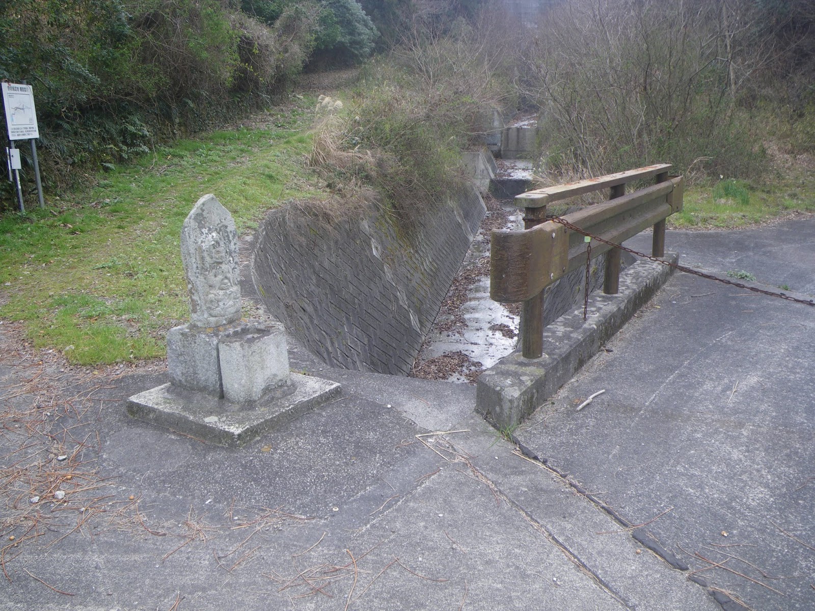 荒れた沢筋の遍路道を下る。途中沢に架けられた簡易橋(11時55分)で沢の右岸に渡りそこから数分歩くと道の右手に西国観音霊場九番 興福寺の本尊である不空羂索観音が立つ。その辺りになると空も開け、里が近づいた実感。大きな砂防ダム脇にでる。