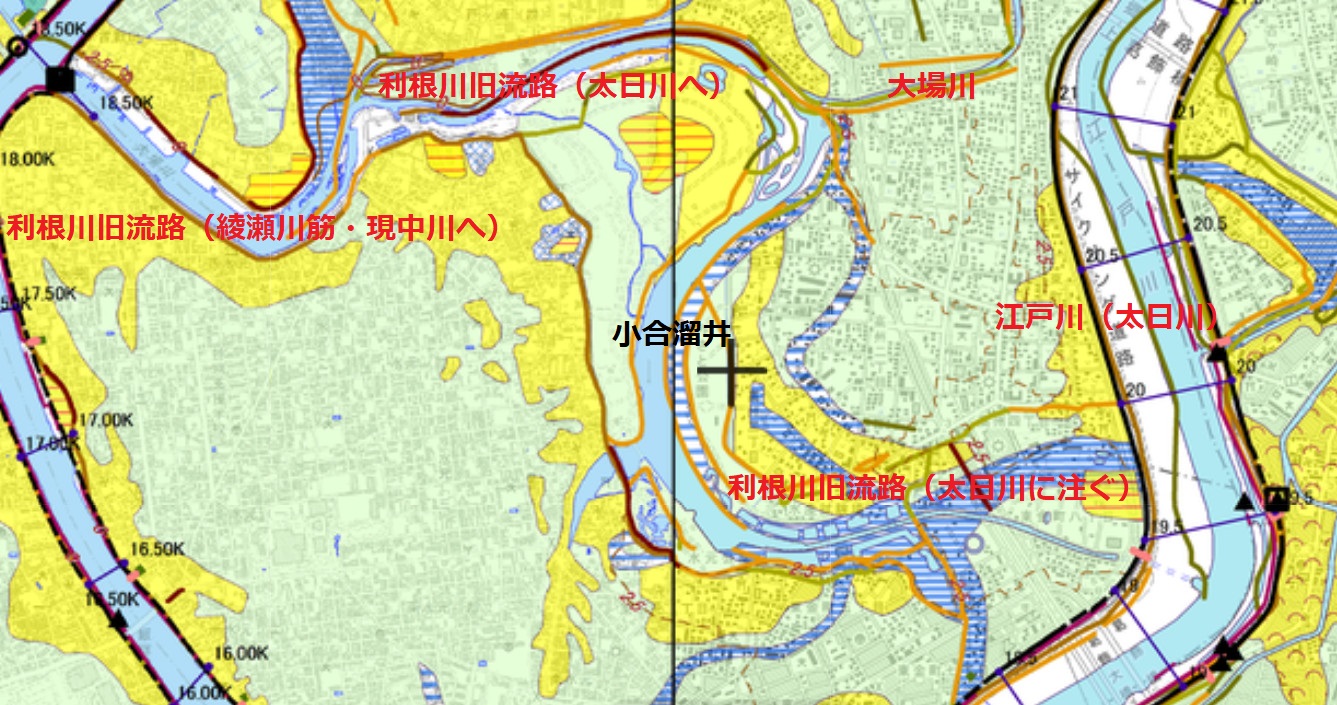 またもう一つの流れ、川口から南に下った古利根川(現在の大落古利根川)は西遷事業(寛永6年;1629)施行以前の荒川(現在の元荒川)と越谷で合さり、これも小合川を経て太日川に落とした。この小合川が現在の大場川から小合溜井へと向かう川筋である。川口で分かれたかつての利根の流れがこの地で合わさった。
