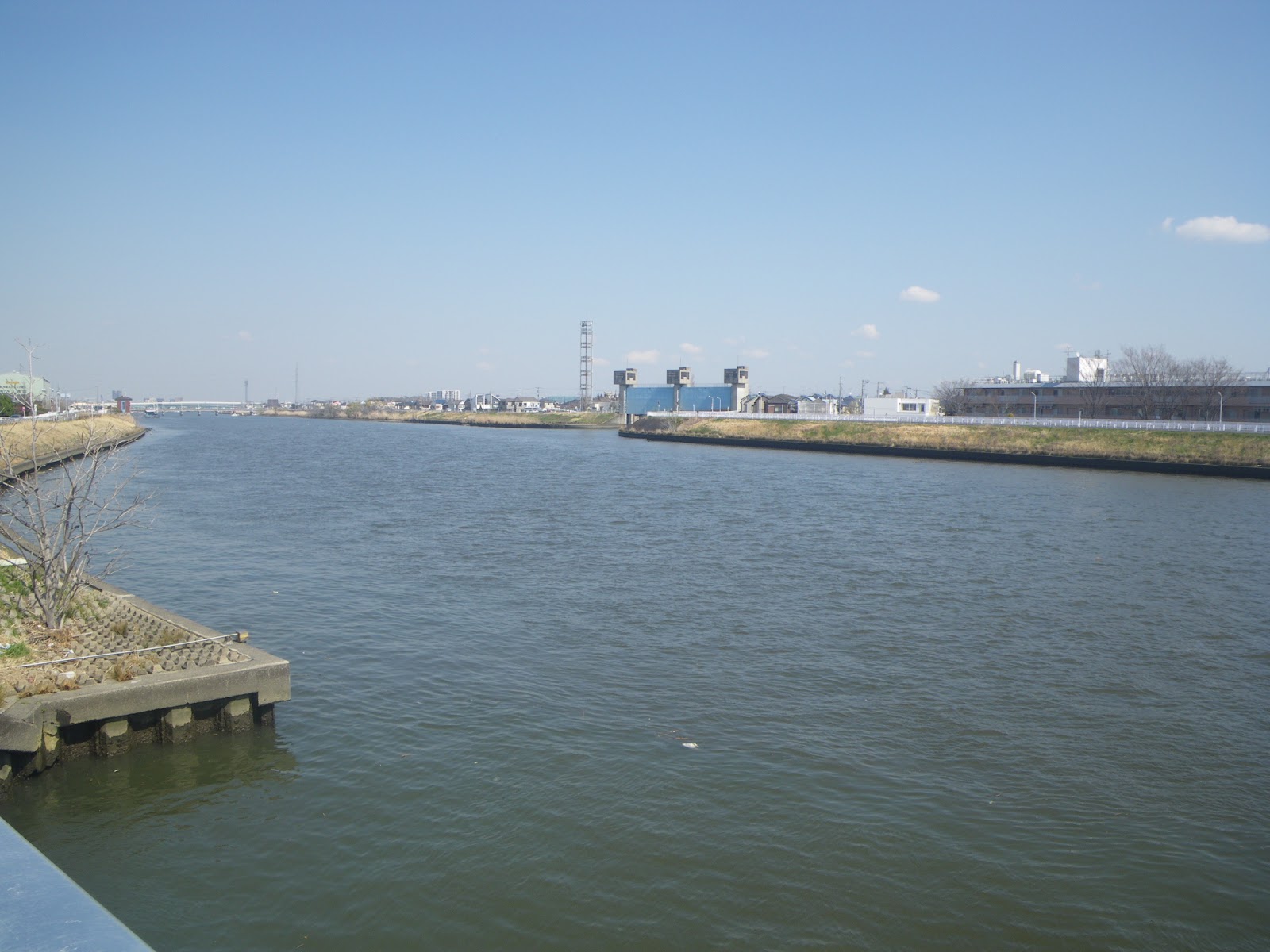 中川の対岸に大場川水門が見える。かつて小合川合流点で東西に分かれた古利根川が、綾瀬川筋に注いだ箇所あたりだろうか。現在小合川筋には大場川が流れる。