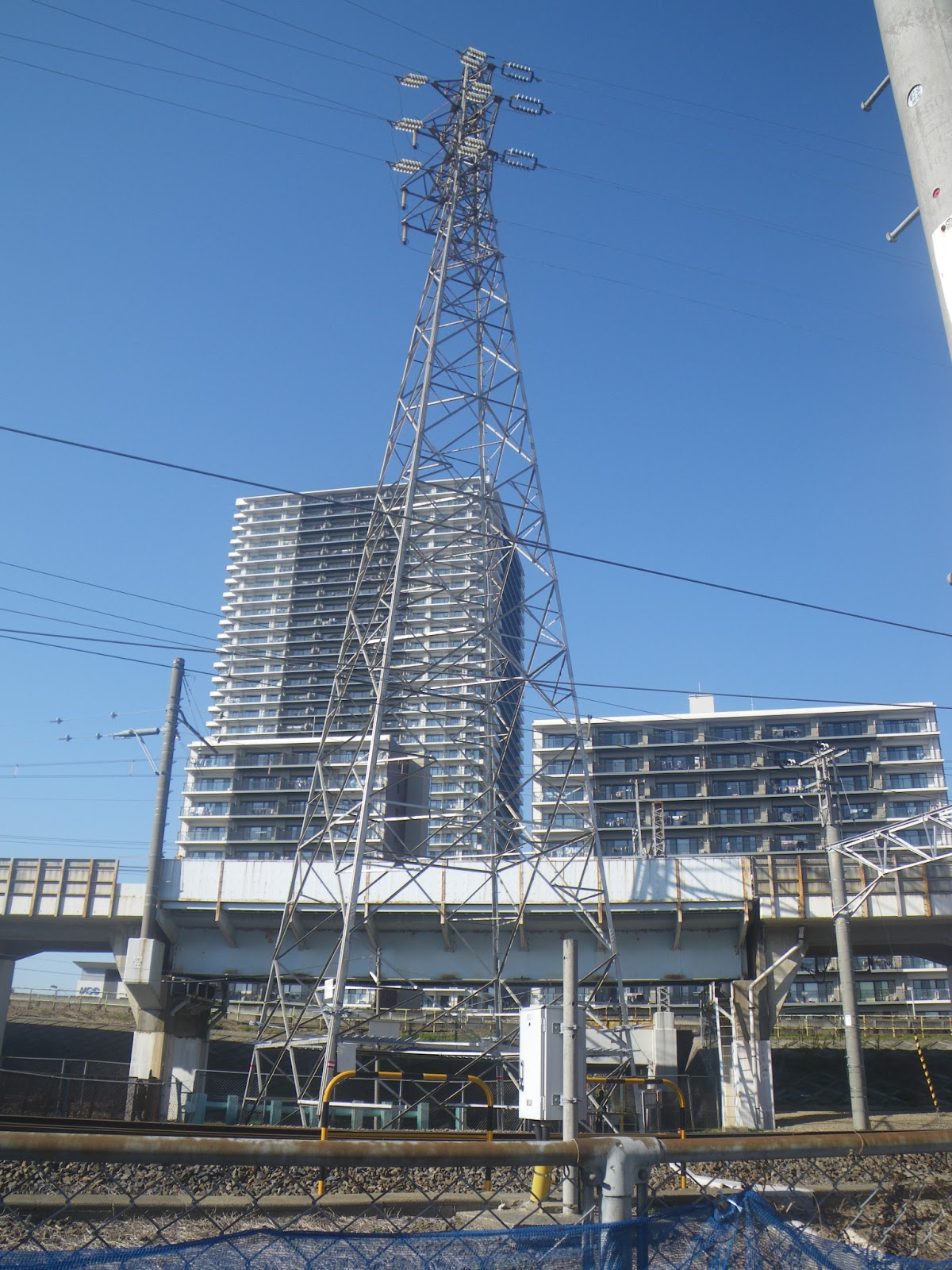 中川右岸が2号鉄塔、左岸が3号鉄塔。1号鉄塔は足立区にあり、東亀有線13号鉄塔より分岐する。東亀有線は東亀有線は東京都足立区の青井線8番鉄塔から東京都足立区の東亀有変電所を結ぶ路線であり。。。、と送電線網はとこまでも続くため、このあたりで思考停止としておく。