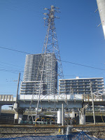 更に少し下ると常磐線の鉄橋にあたる。鉄橋が中川を渡った対岸を見ていると、ビルや民家の立て込むところに送電線鉄塔が見える。その周辺には送電線鉄塔も見えず、しかも送電線が斜め下方向に降りている。なんだこれは?民家のど真ん中に降りては危険では?