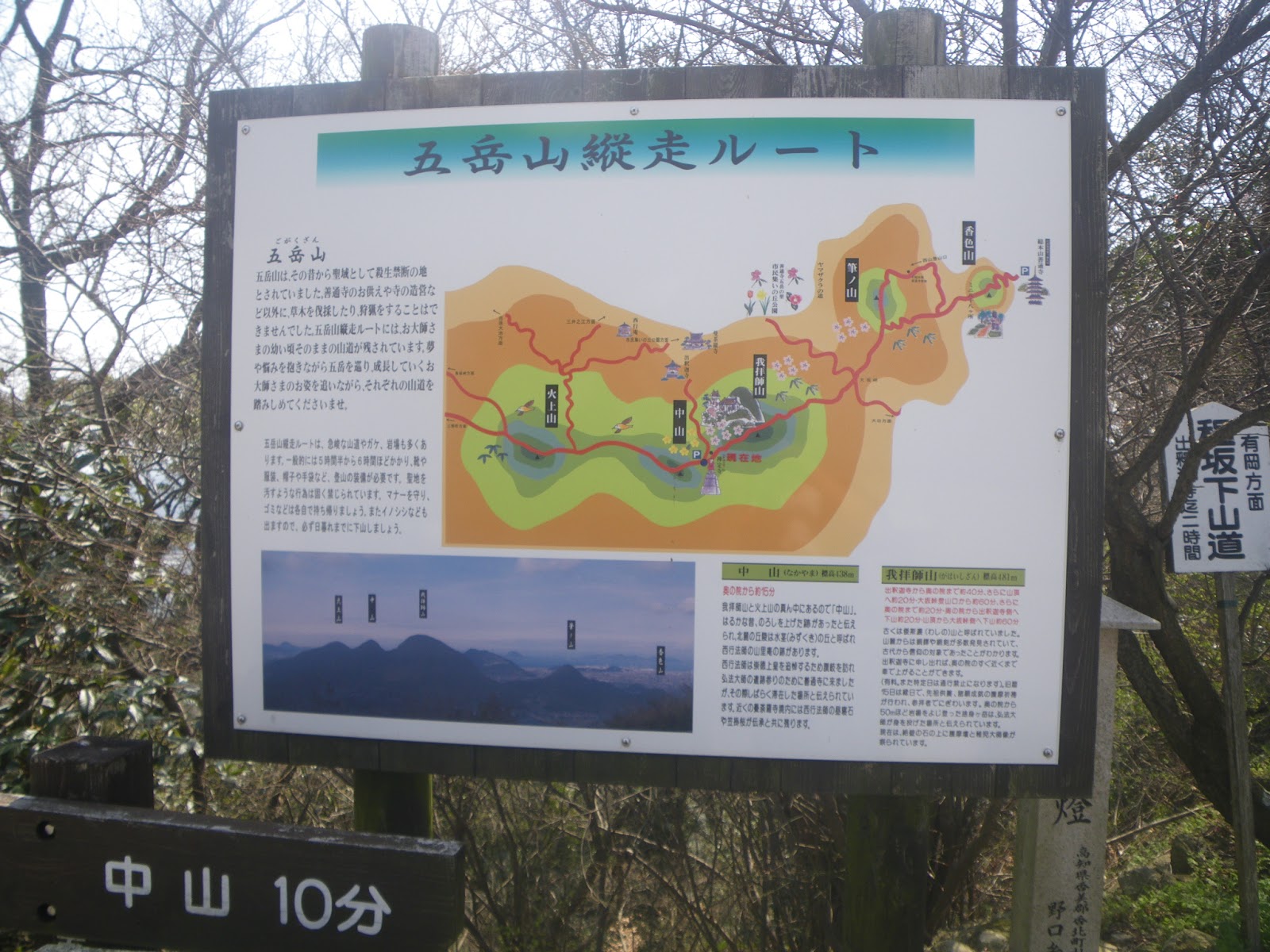 讃岐五岳とは札所・善通寺の裏から連なる山並み。香色山〔こうしきざん〕、筆の山、我拝師山、中山、火上山〔ひかみやま〕という五つの山のことを指す。なお、善通寺の山号は五岳山とする。大師修行の場とされる五岳ゆえの山号ではあろう。