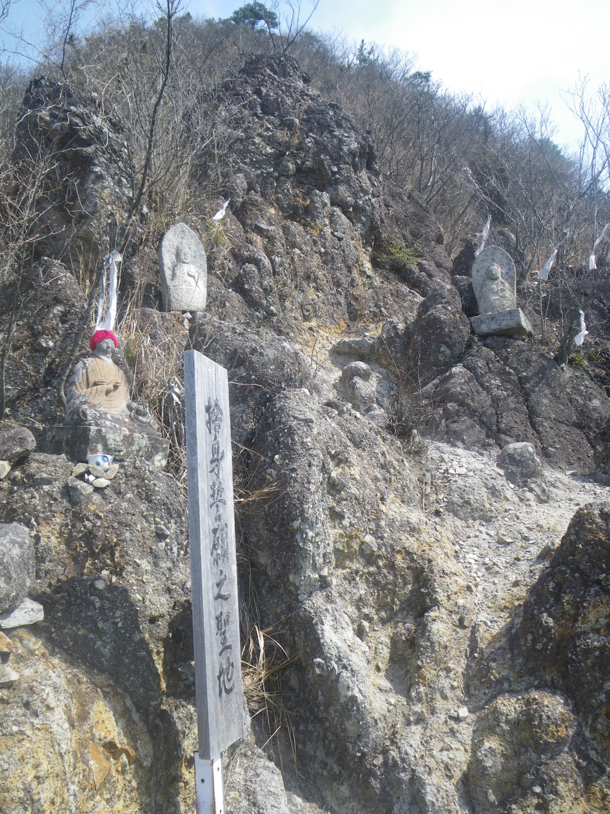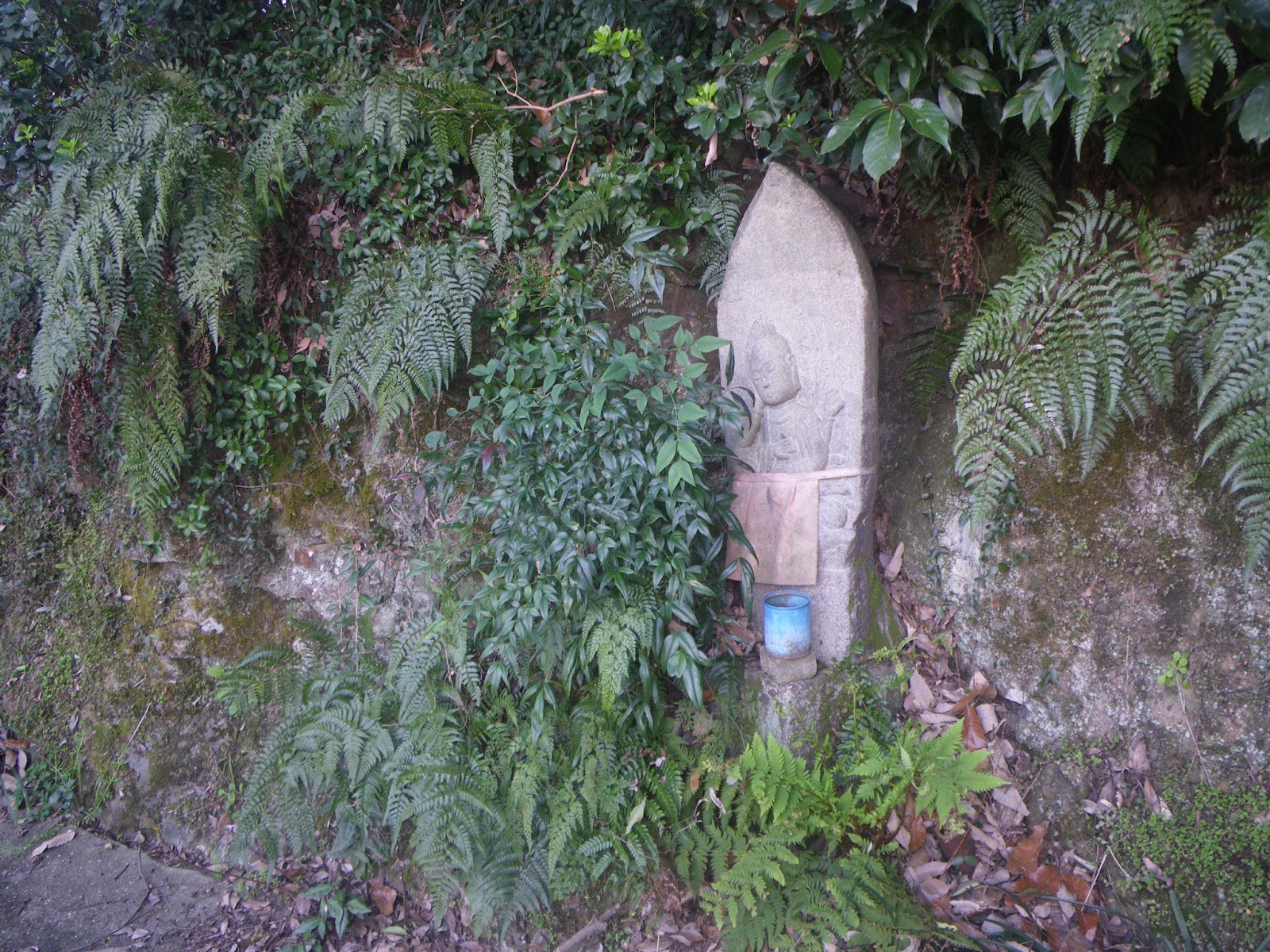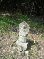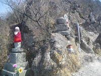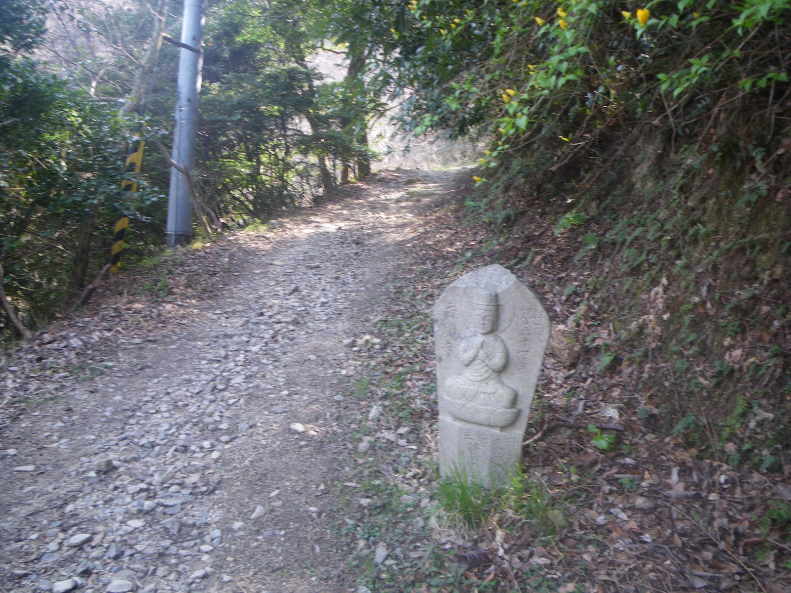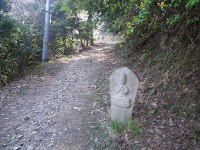 境内から成り行きで山へと向かう簡易舗装の道を奥の院禅定へと向かう。道端には舟形石仏が立つ。四国遍路の札所の本尊石像のようだ。道はほどなく出釈迦寺東の駐車場と出釈迦寺の間を南に上ってきた車道と合流する。