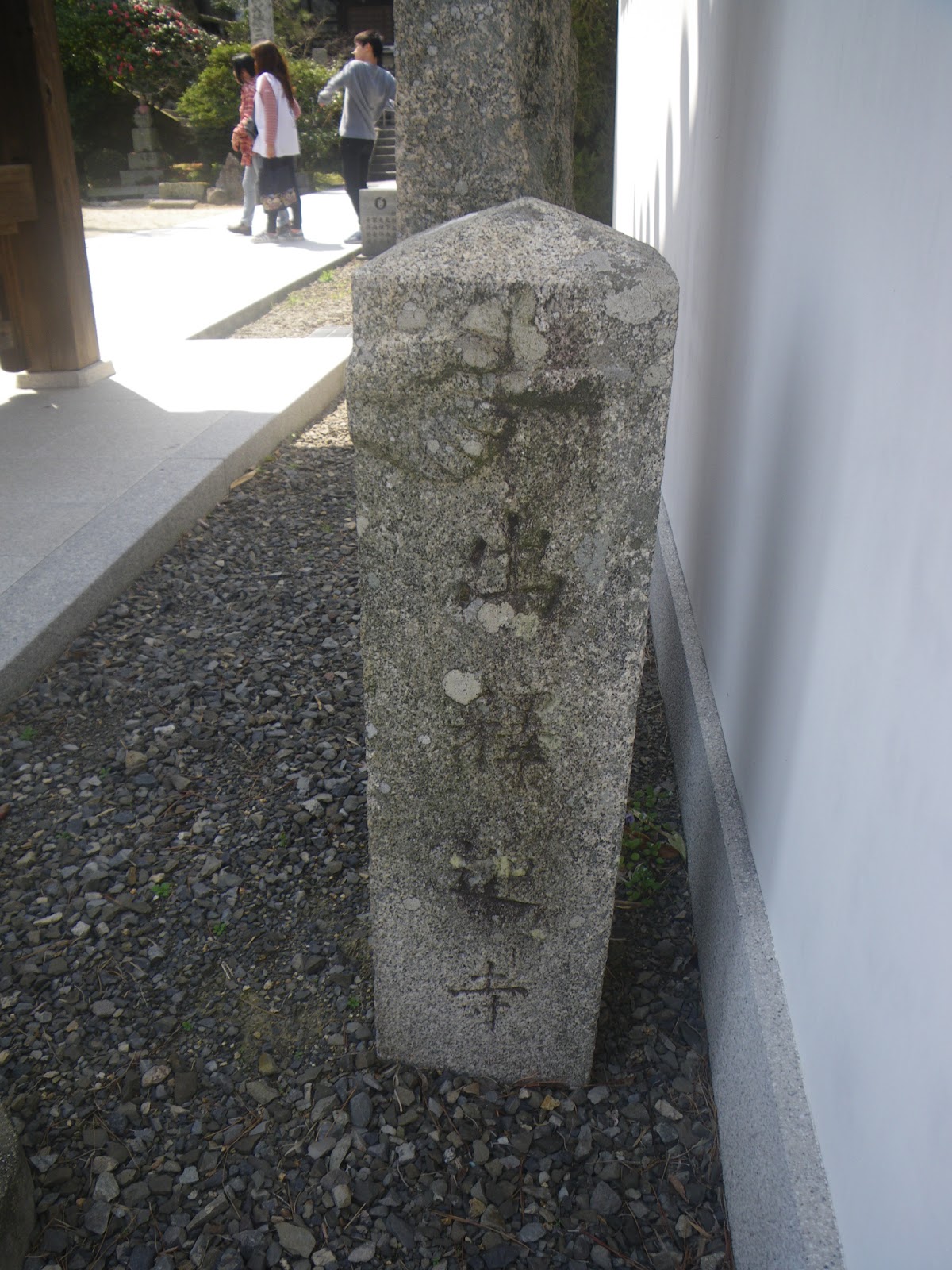 坂を上ると山門手前、右手にひらべったい石に刻まれた道標がある。手印と共に「七十三番ココデス 捨身ケ嶽十三丁 七十二番ソコデス 七十四番十六丁」と刻まれる。
