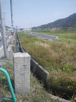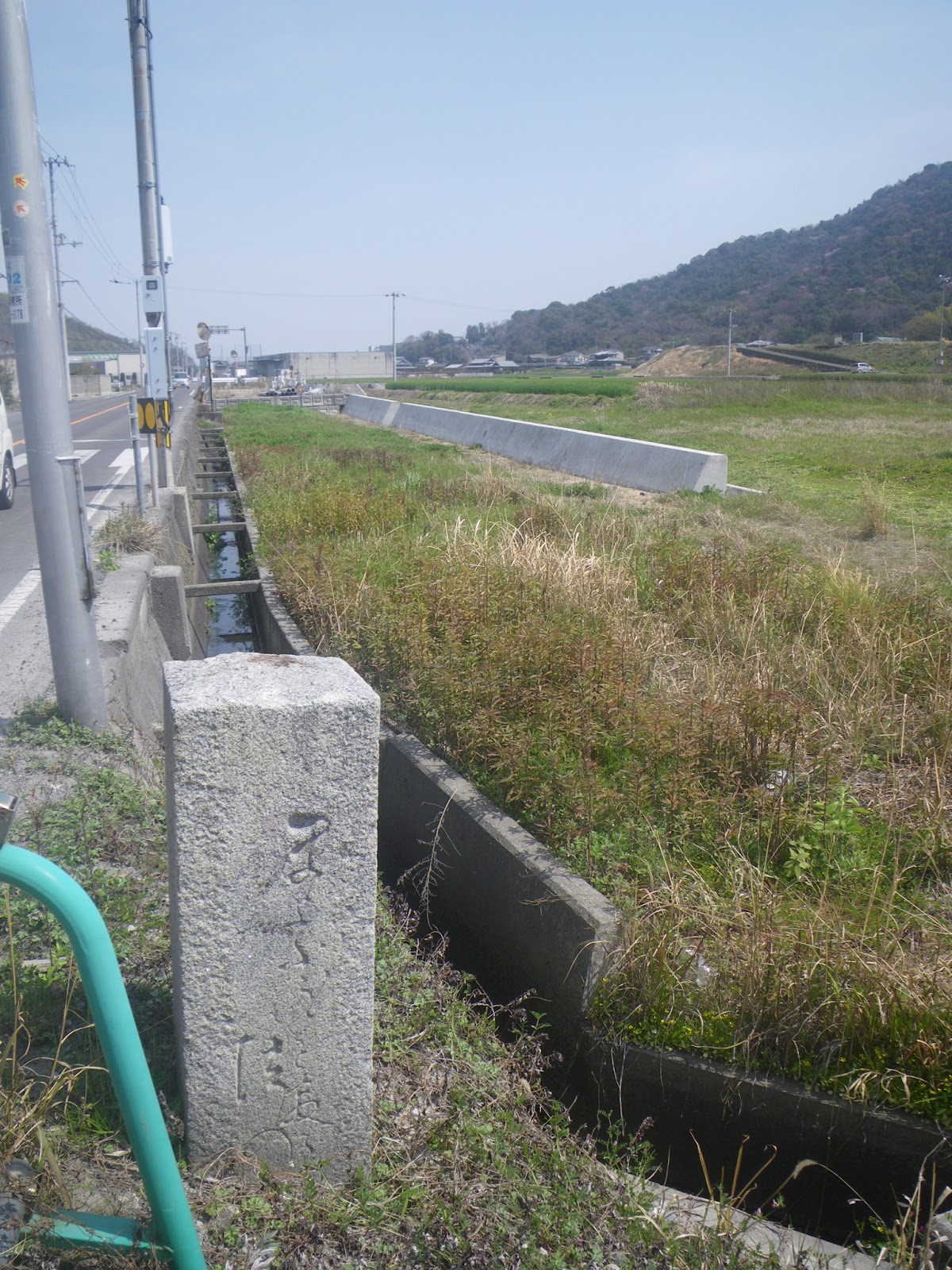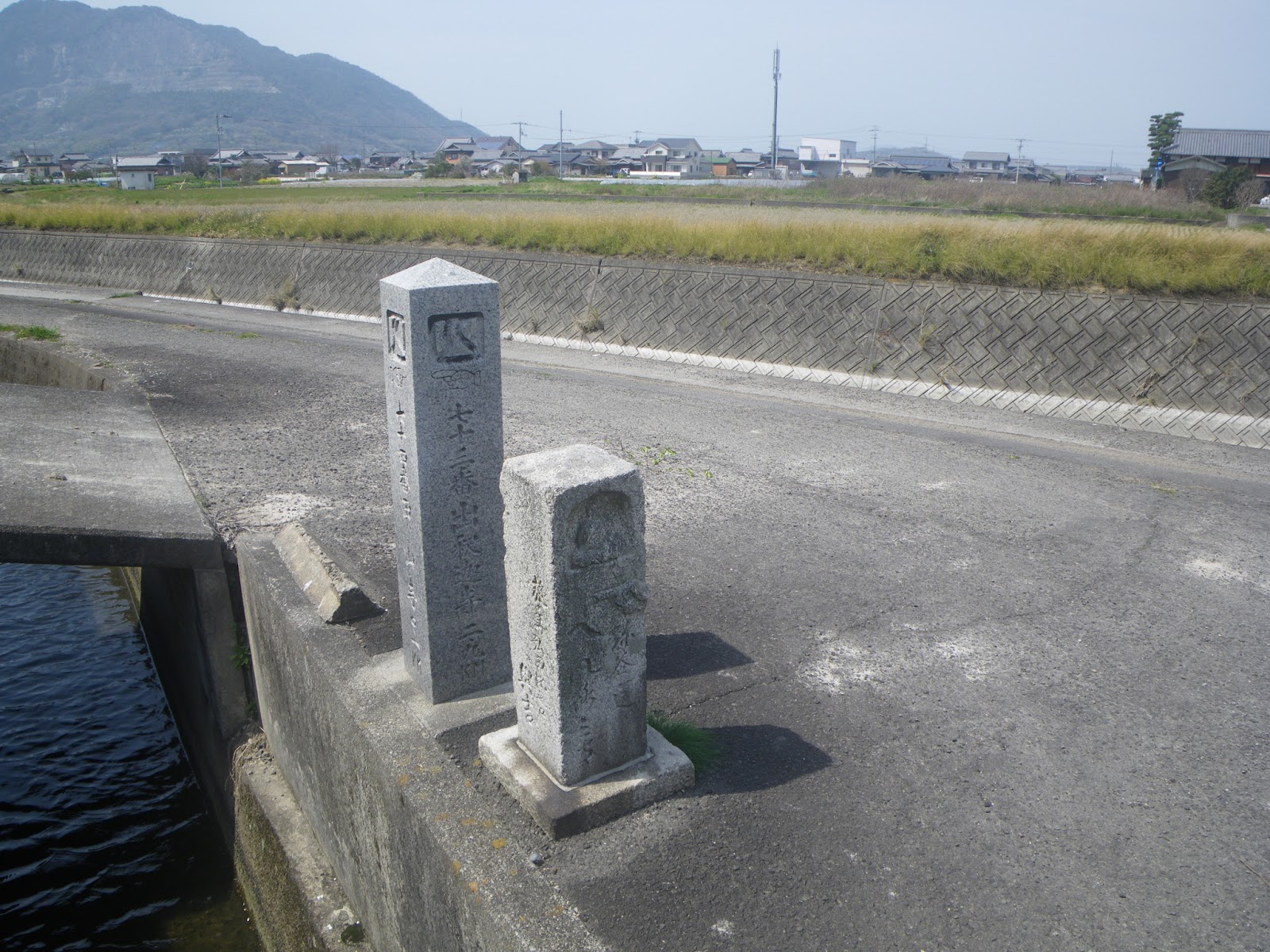 甲山寺から善通寺に向かう。距離にして1キロほど。境内を離れ、弘田川に架かる橋に向かう。と、橋の少し北、用水路取水水門や取水施設のあるところに標石が立つ。