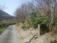 西行庵を離れ、少し西に進んだ後、北に丘を下る舗装された道を進み、曼陀羅道を曼陀羅寺へと歩いた途中にあった西行庵分岐点の自然石道標まで戻る。