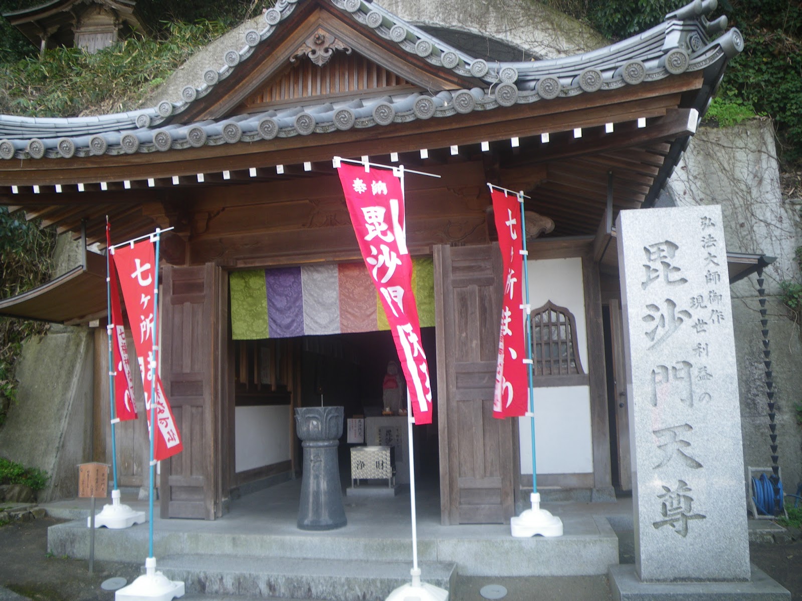 大師堂の左に毘沙門天を祀る洞窟がある。洞窟に入ると中央に石の毘沙門天が祀られる、と。
