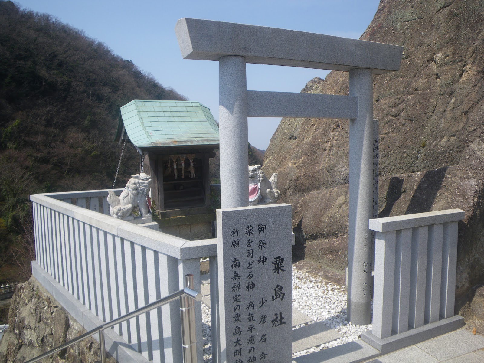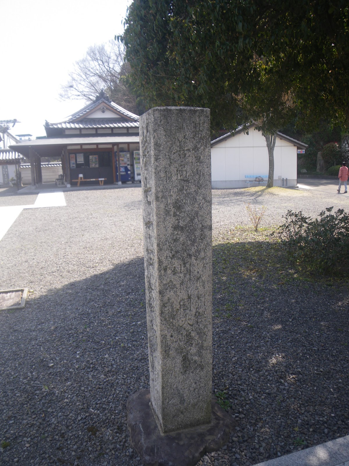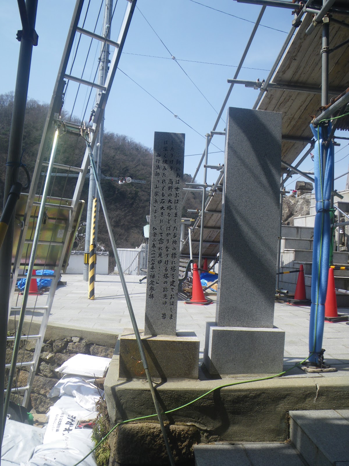 割と新しい石灯籠の建ち並ぶ駐車場入口に、これも新しく立てられたような西行歌碑がある。「筆の山 かき登りても見つるかな 苔の下なる岩のけしきを」と刻まれるこの歌は、出釈迦寺で見た西行の歌と同じく『山家集』におさめられたものである。