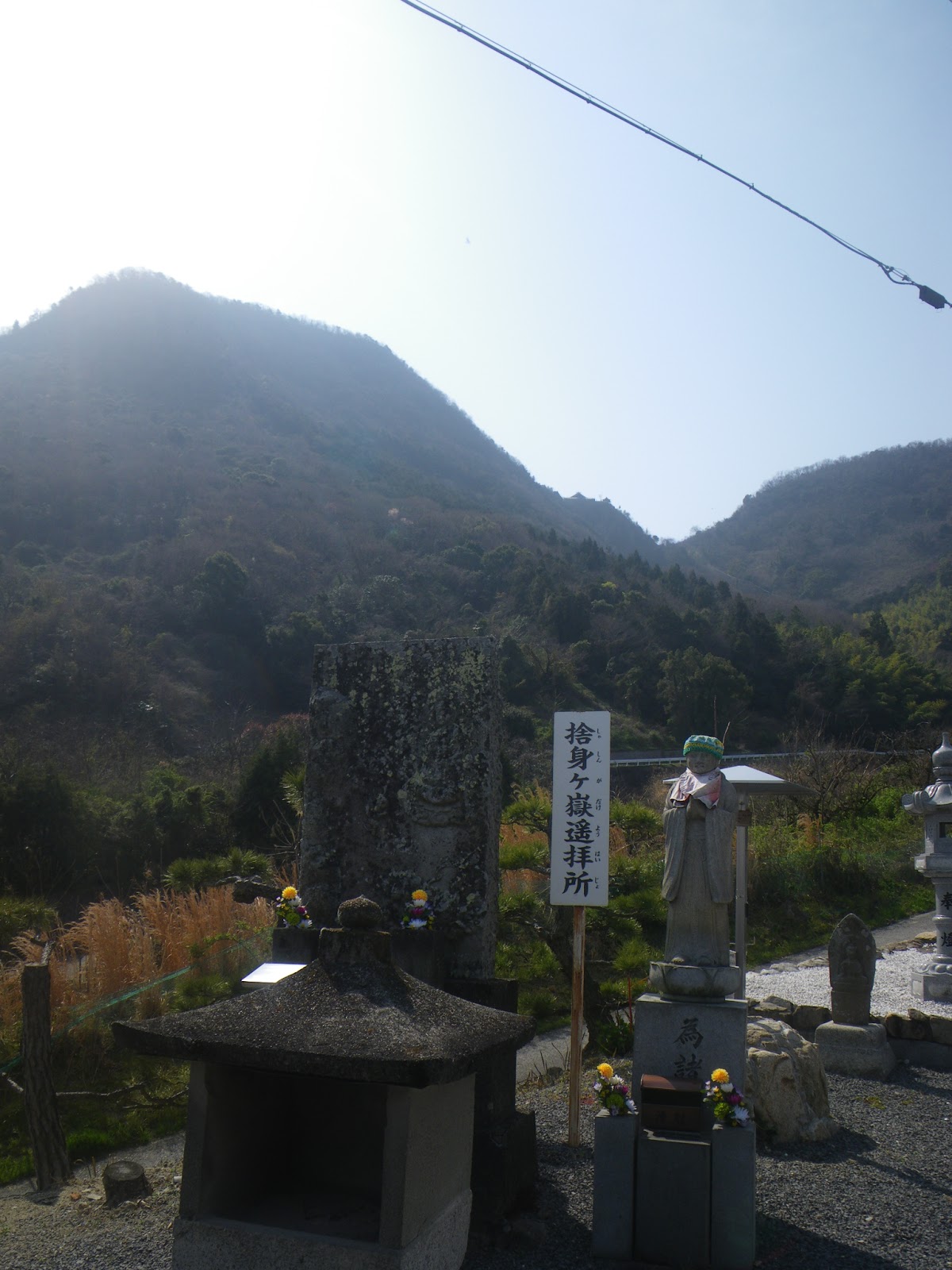 本堂より一段高い地蔵堂(虚空蔵堂?)へと石段を上ると、捨身ケ嶽遥拝所がある。大師像の横に石碑があり、そこには身を投げる空海とそれを救う釈迦如来と天女の図が描かれるとのことだが、風雨に晒され絵柄を見ることができなかった。我拝師山をよく見れば、奥の院らしき建物も見える。遥拝所横に立つ石仏は虚空蔵菩薩と言う。