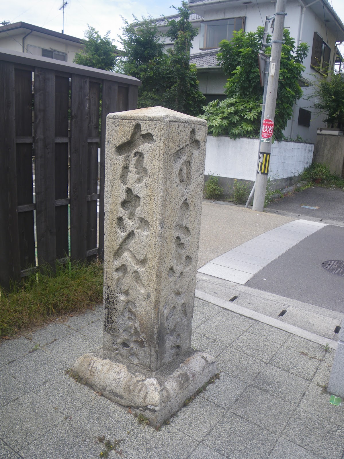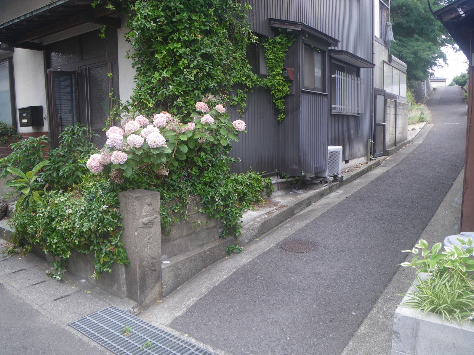 この鳥居前で、上述「誰袖の標石」ルートと合流するもうひとつの遍路道がある。そのルートは上述県道194号の高架を潜ると直ぐ県道を逸れ、右に折れる脇道に入る。ほどなく手印と共に「七十八番郷照寺」と刻まれた標石があり、そこを右折。緩やかな坂をのぼり、そして道なりに坂を下ると鳥居前に出る。遍路タグはこちらの道を示していた。