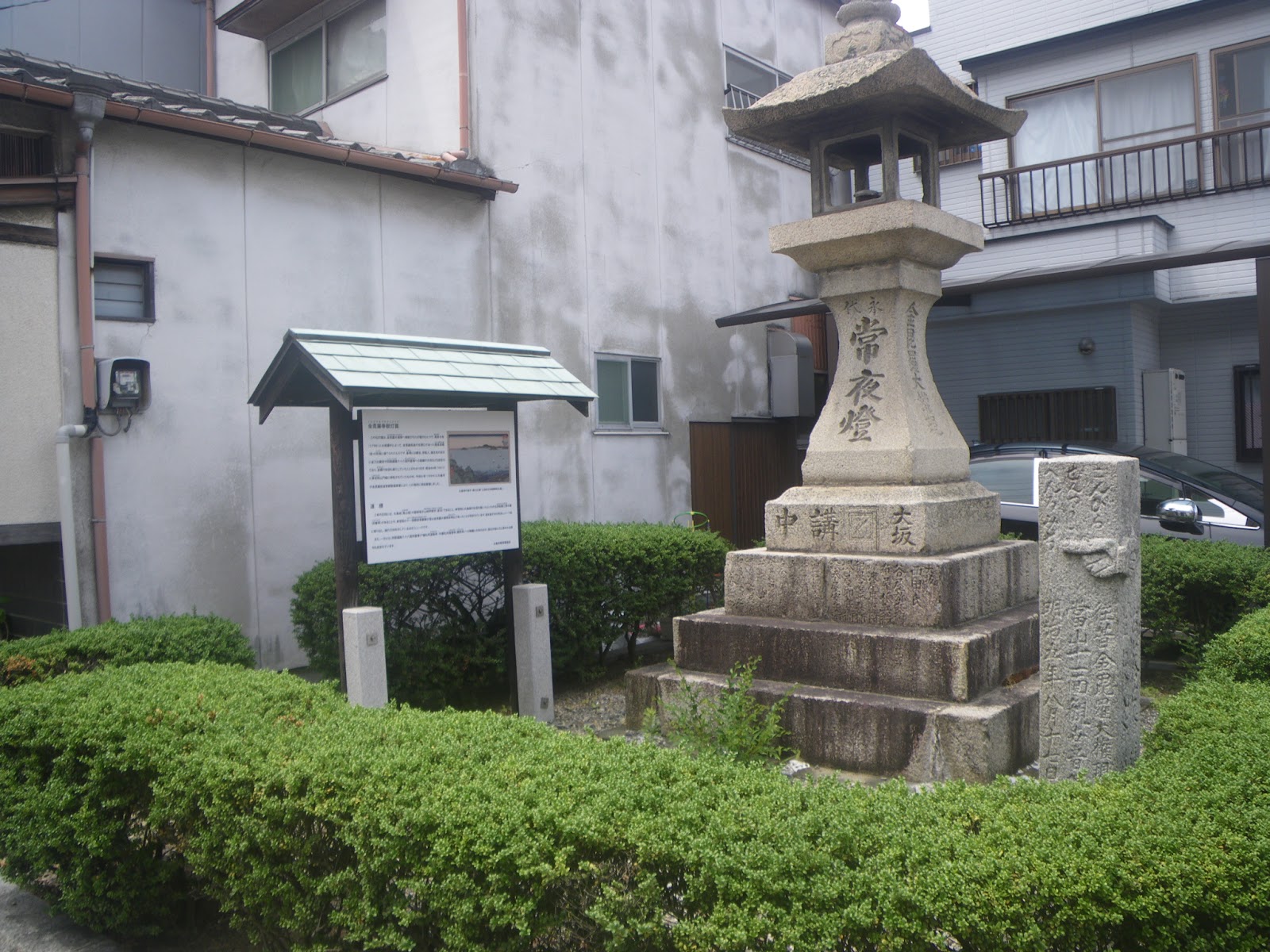 ルート図を辿り金毘羅標石の道を隔てた北、寿覚院と民家の間の道を進む。と、ほどなく寿覚院山門前に金毘羅常夜灯と標石が立つ。常夜灯には「大阪講中」と刻まれる。標石には手印と共に、「こんぴら せんつじ へんろみち」「往昔金毘羅大権現 當山十一面観世音 明治五年」と言った文字が刻まれる。