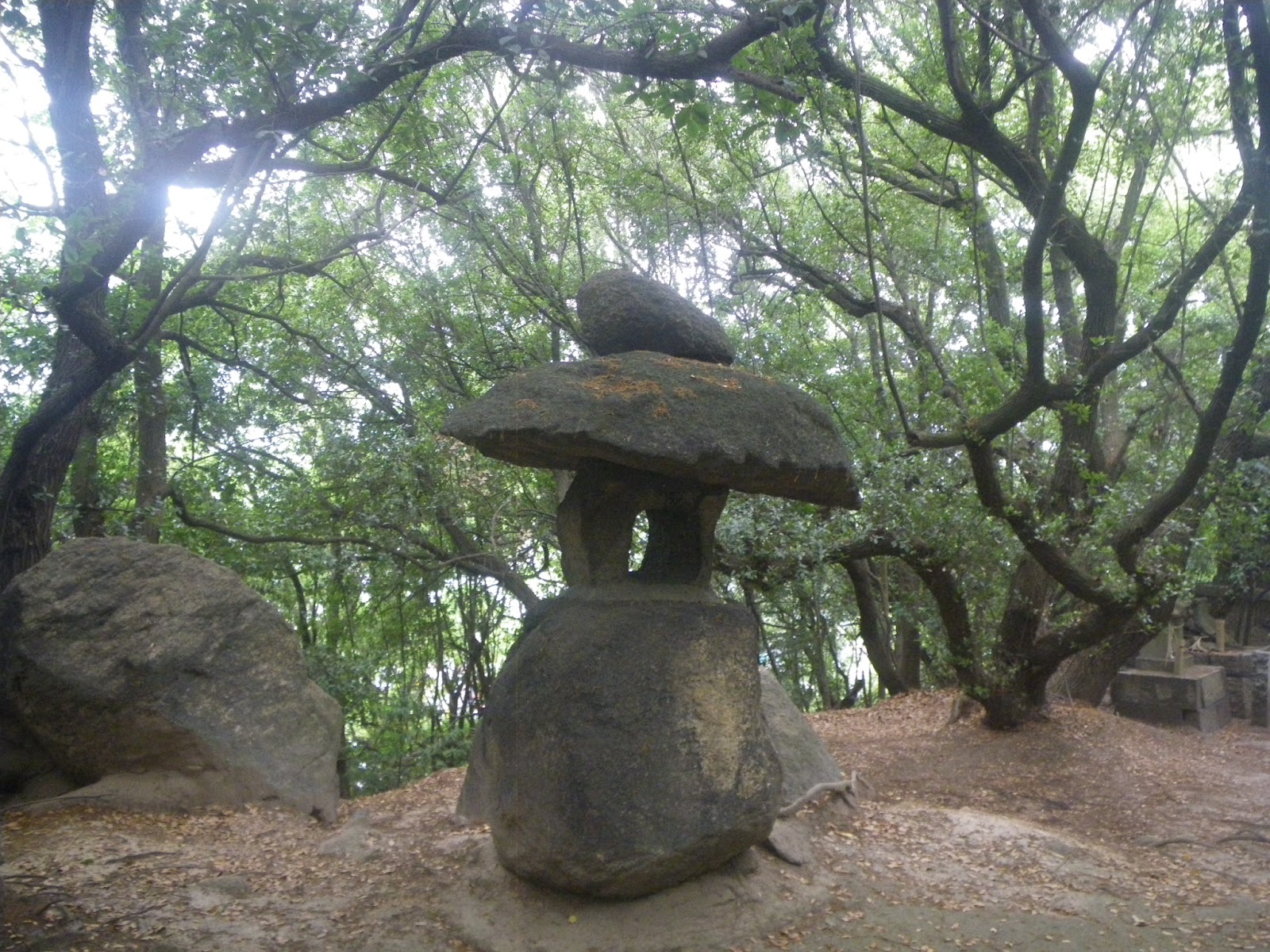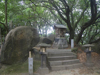 本殿裏手に巨大な岩があり、それが巨岩。本殿右手、これも巨大な石灯篭の立つあたりに御膳石があった。古代祭祀が行われていた場所に社が建てられた、ということだろうか。