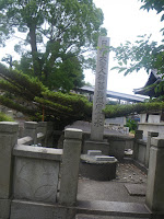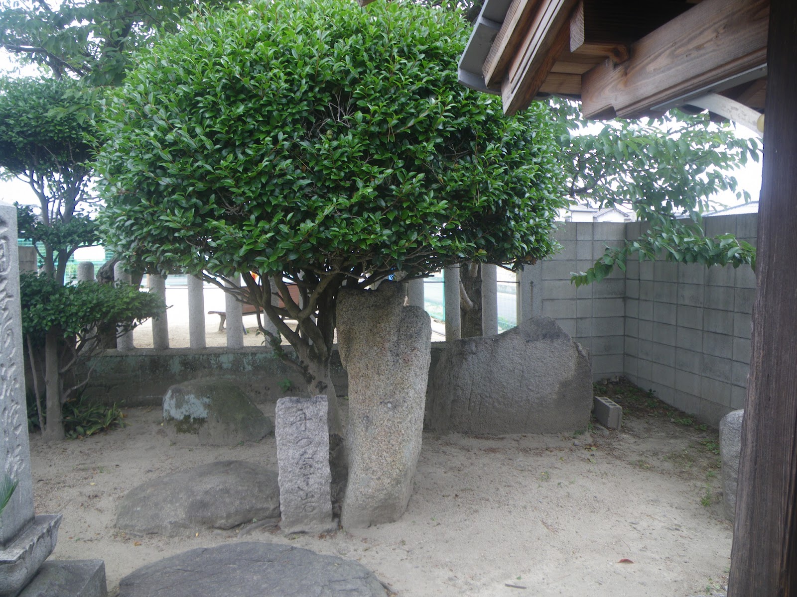 井戸の東、木の下に二つの石碑がある。ひとつは「舟つ奈き岩」とある。法然上人上が讃岐上陸の折の岩だろうか。またその横に自然石。何か刻まれているようだがはっきりしない。自然石に「ほうねん上人かいの水 南無(なむ)は船阿弥陀(あみだ)のかいで堀(ほる)清水(しみず)末の世までも仏仏(ふつふつ)とわく」と刻まれるとの記事があったので、その石碑かもしれない。