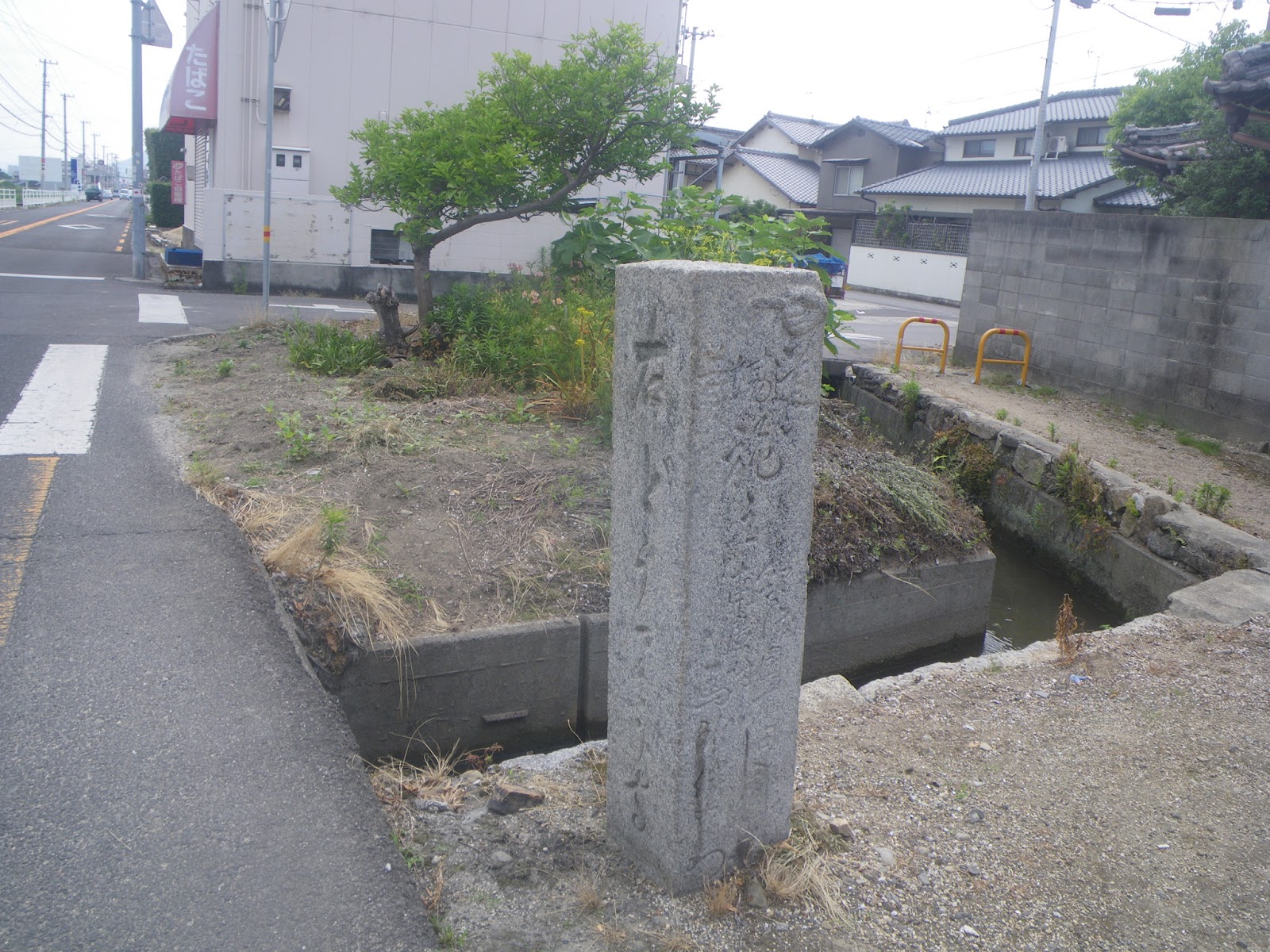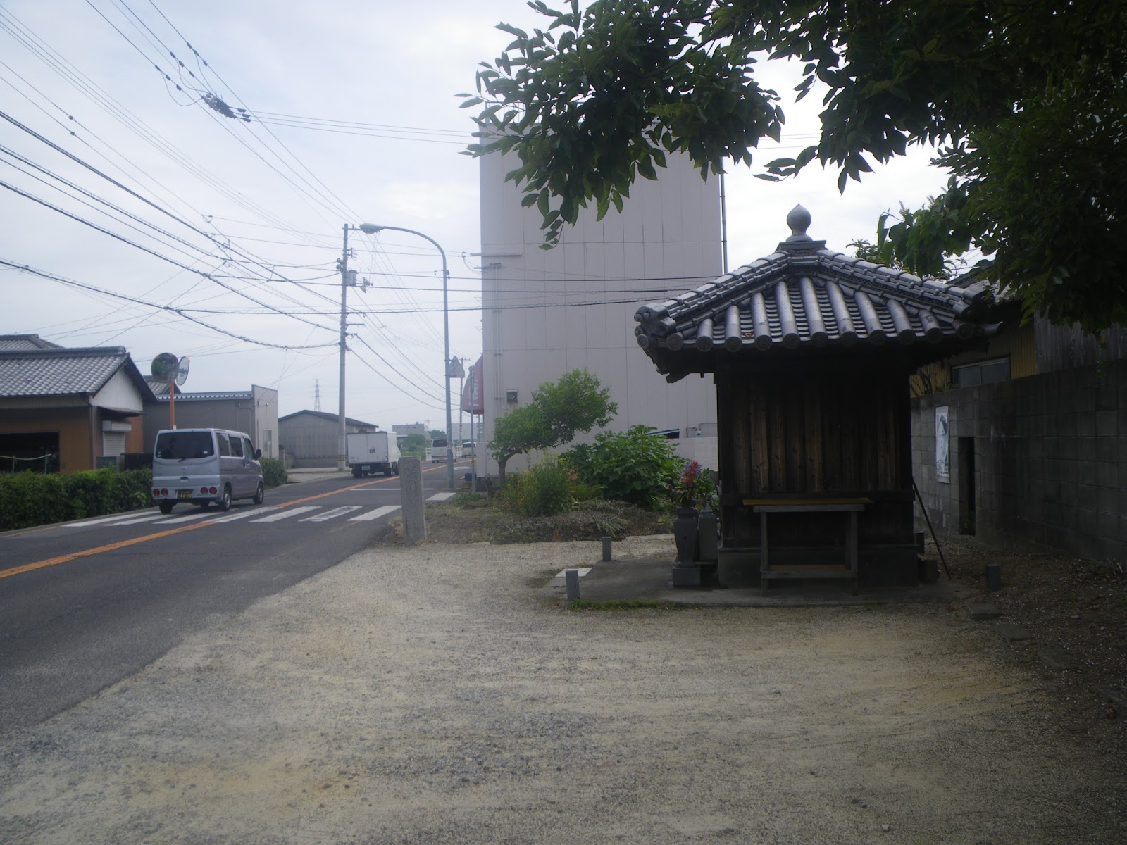 道隆寺を出て東に向かった道はすぐ丸亀市域に入る。丸亀に入って直ぐ、道の右手に地蔵堂があり、その脇に茂兵衛道標が立つ。「右どう里う寺 左道場寺 明治二十七年」と刻まれる。茂兵衛134度目巡礼時のもの。道場寺は七十八番札所・郷照寺の古い呼び名である。