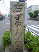 その角に「是より天の社まで一里半」と刻まれた徳右衛門道標がある。 天の社は七十九番札所 高照院天皇寺のこと。郷照寺はここを右に曲がり、ゆるやかな坂を上る。