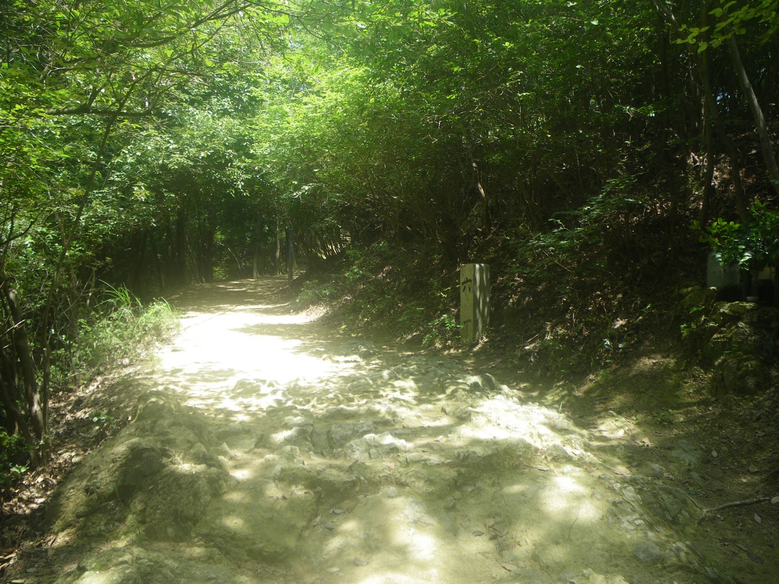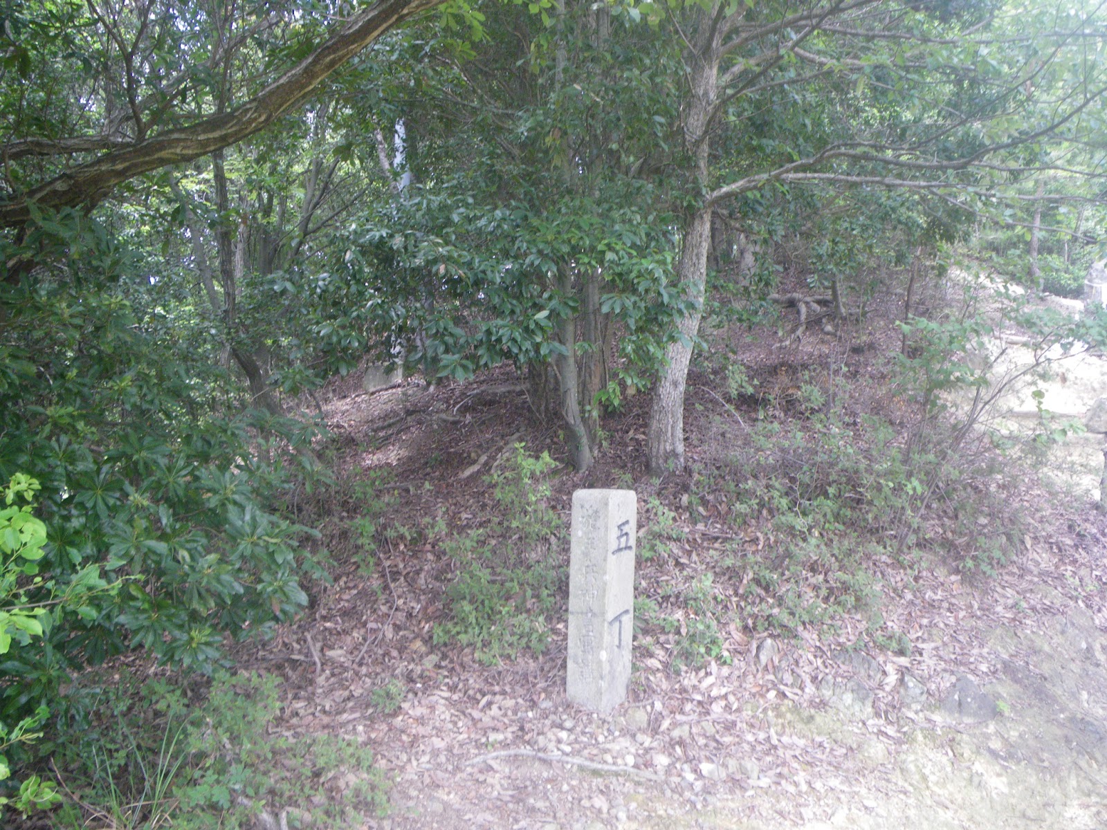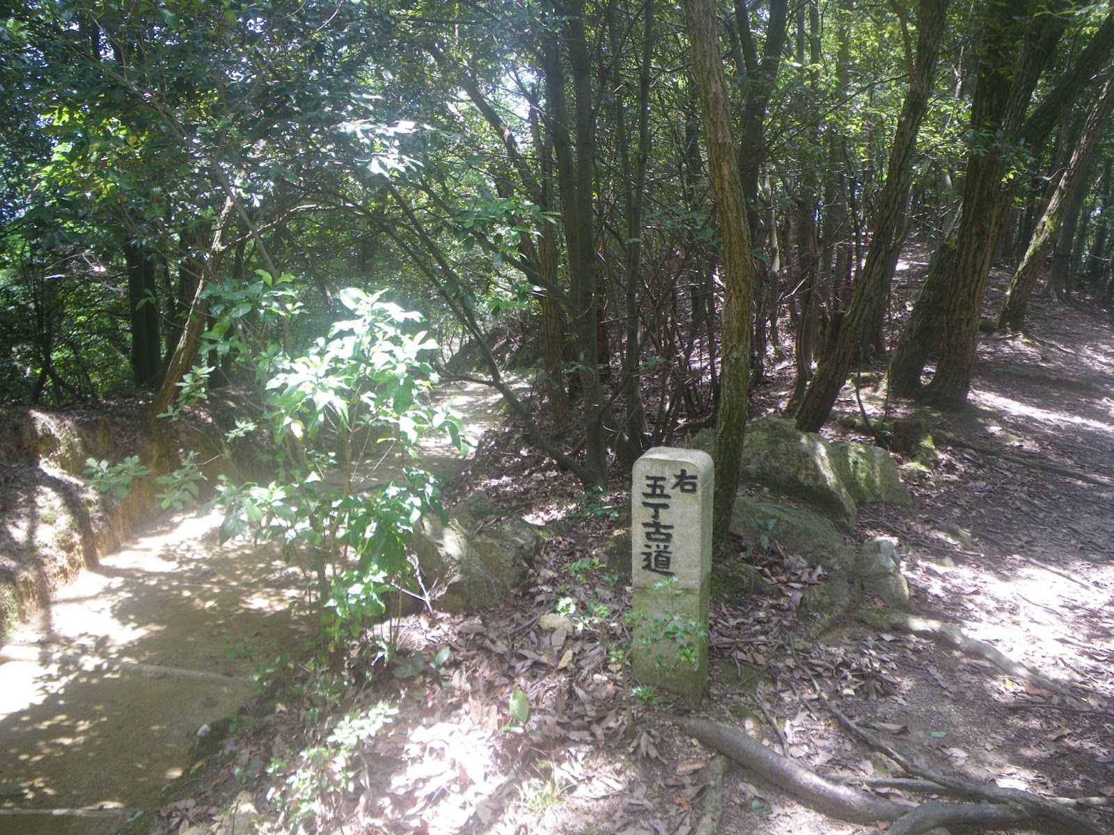 大日如来の石像を越えた先に「五丁古道」の案内。整備された登山道を離れ木々に覆われた道に入る。1分ほど歩き、再び整備された登山道に戻る。