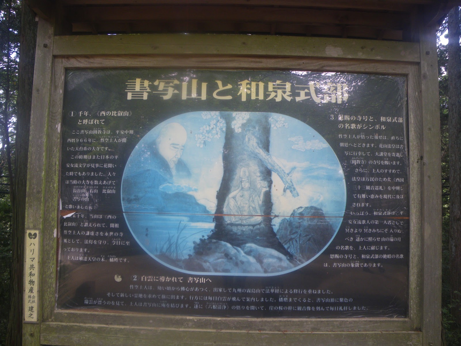 「書写山と和泉式部」の案内には、西の叡山と呼ばれた書写山圓教寺の説明、性空上人の開山縁起、和泉式部と性空上人との関りが書かれる;「1.西の叡山と呼ばれて 書写山圓教寺は平安中期、西暦966年に性空上人が開いた天台宗の寺。この時期は平安女流文学が花開いた時期でもある。人々は当時の大寺を数え上げ、長谷山、石山、比叡山、書写の山と歌った。以来千年、圓教寺は西の比叡山と呼ばれ現在に法灯を伝える。上人は敏達天皇の末、橘姓