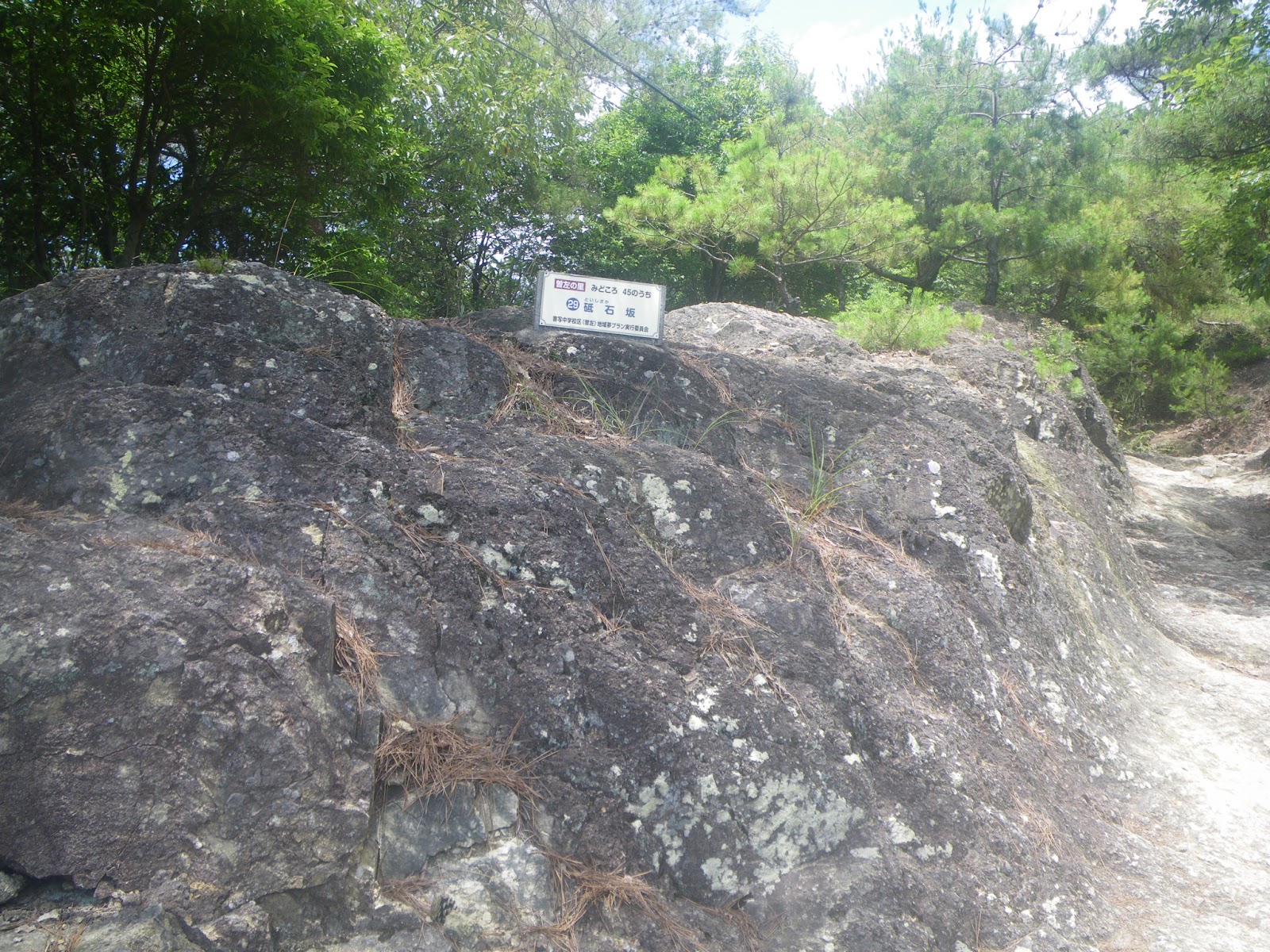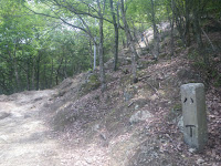 上下に続く岩場を見遣り十一丁に。「砥石坂」の案内がある。説明はない。東坂参道のことを「砥石坂」と呼ぶ、また、7歳から10年間に渡りこの書写山で修行した弁慶が長刀を研いだ故に「砥石坂」といった記事がWEBにあった。