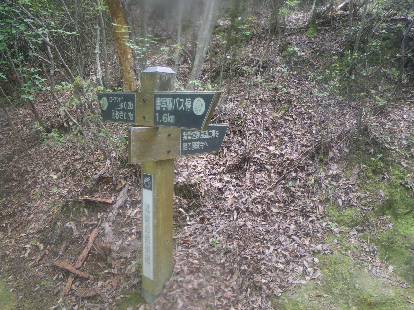 数分上ると木標。「ロープウエイ山頂駅0.2km 円教寺0.7km 」「紫雲堂跡展望広場を経て圓教寺へ」と言った案内がある。、紫雲堂が如何なるものか知らないが、取り敢えず紫雲堂跡へと登山道を右に折れる。