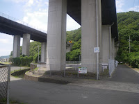 ロープウエイ乗り場手前を左に折れ、山陽自動車道の高架を潜る。高架下に「書写山登山口 250m先右折」の案内があった。