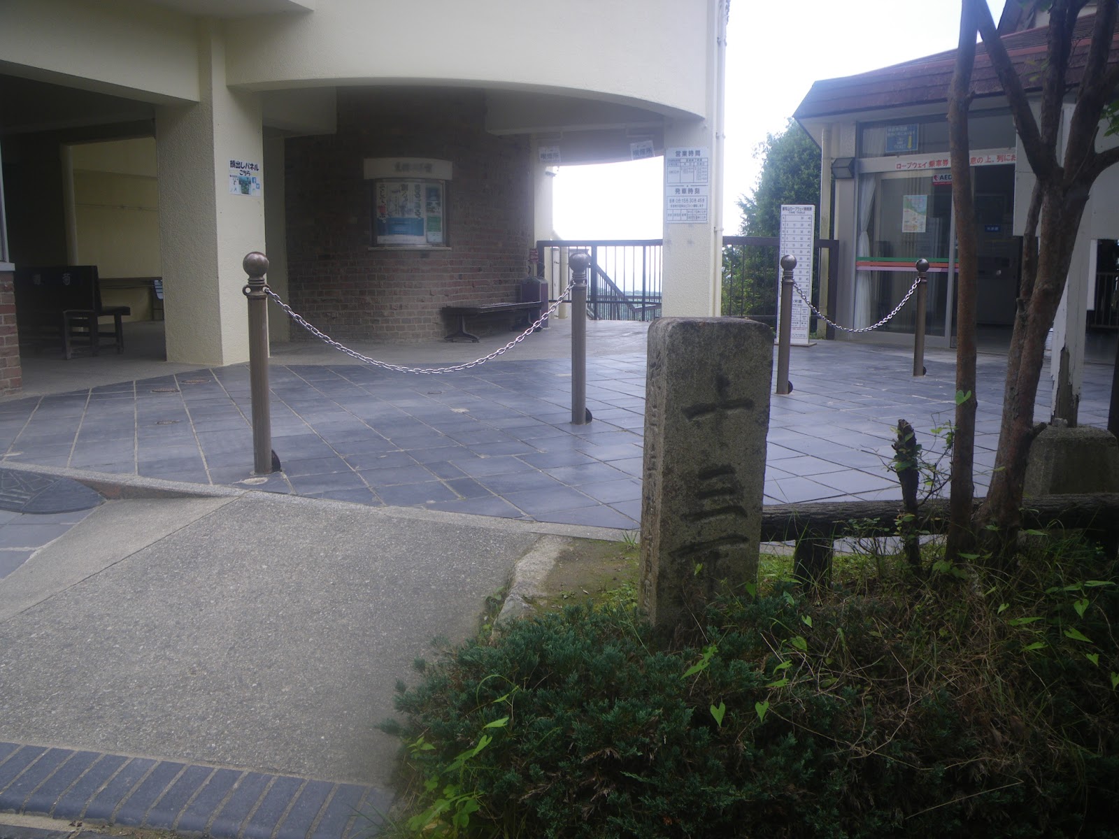 コンクリートで固められたステップを進むとロープウエイの山上駅。その道脇に十三丁の標石。