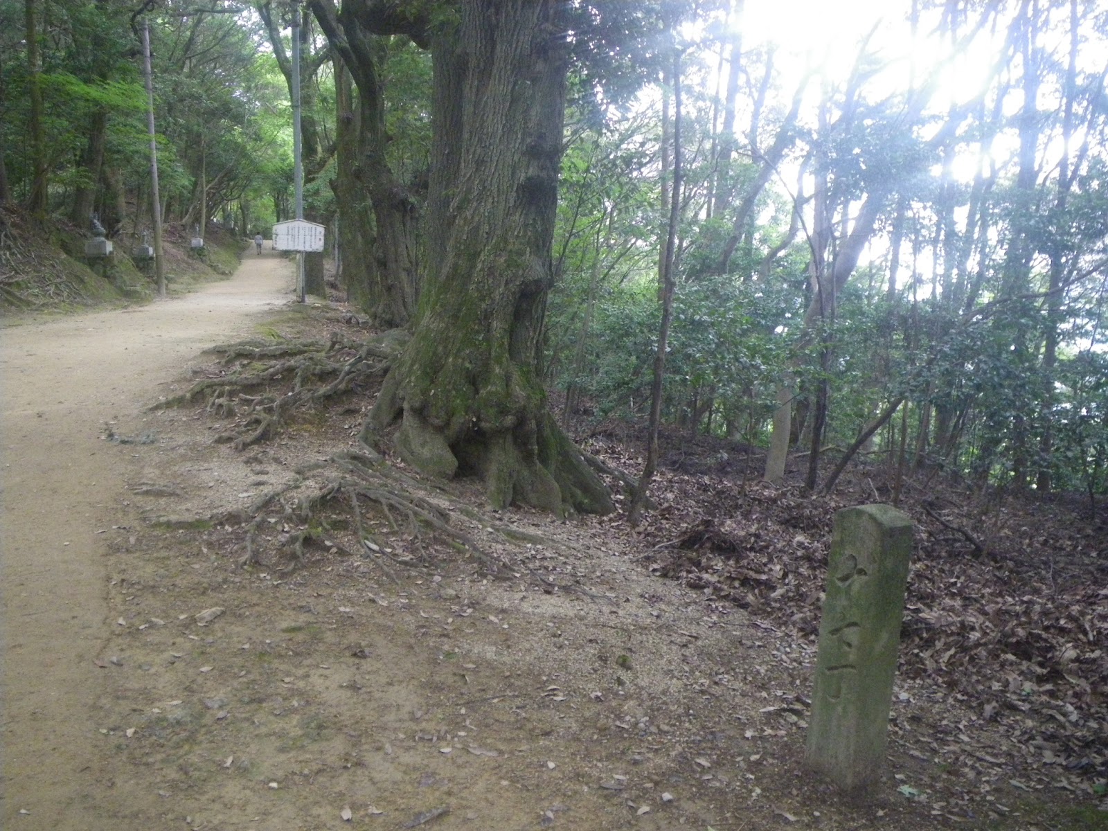 天神さんから道に戻り、山裾の民家の間を進むと四つ辻に標石らしき石と、登山道は右折の案内がある。右折し北に向かうと近畿自然歩道の木標に「東坂参道」と書かれた案内が取り付けられていた。ここにきてはじめて東坂とは圓教寺に上る参道であったことがわかった。