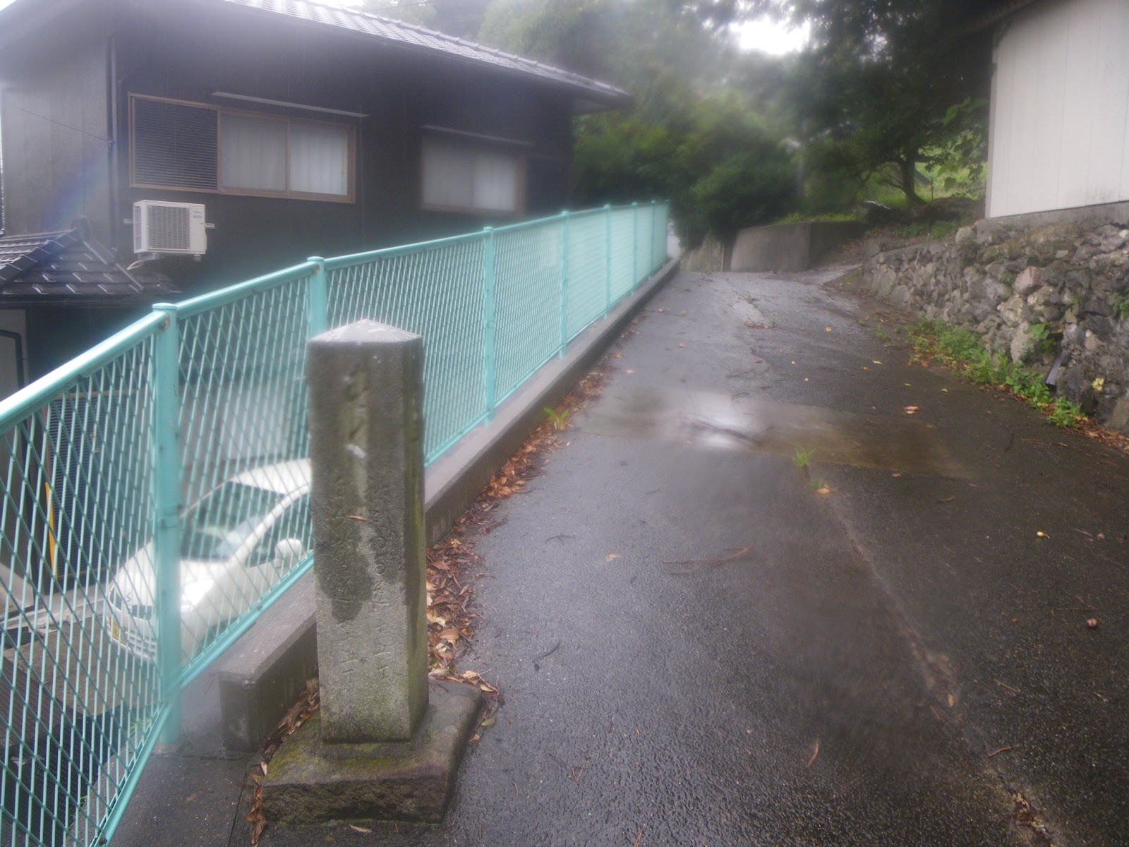 桑崎下橋を渡ると直進方向は民家の鉄骨屋根下に入る。民家の敷地のようでもあるが、その先に坂らしき道筋。控えめに歩を進めると、道は鉄骨屋根の下を抜けて坂に続いており、上り口に標石があった。なんとなく道が繋がった。