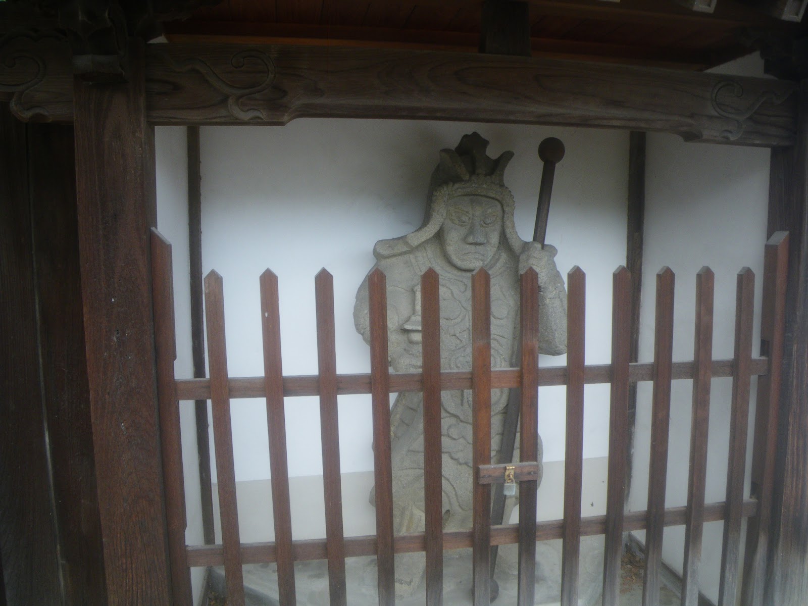 香西寺のすぐそばに萬徳寺。山門は鐘を上部に吊った鐘楼門となっている。また、山門左右に立つ像は石造り。仁王様のようでもあり、仁王・金剛力士と同じく天部の護仏天のようでもある。