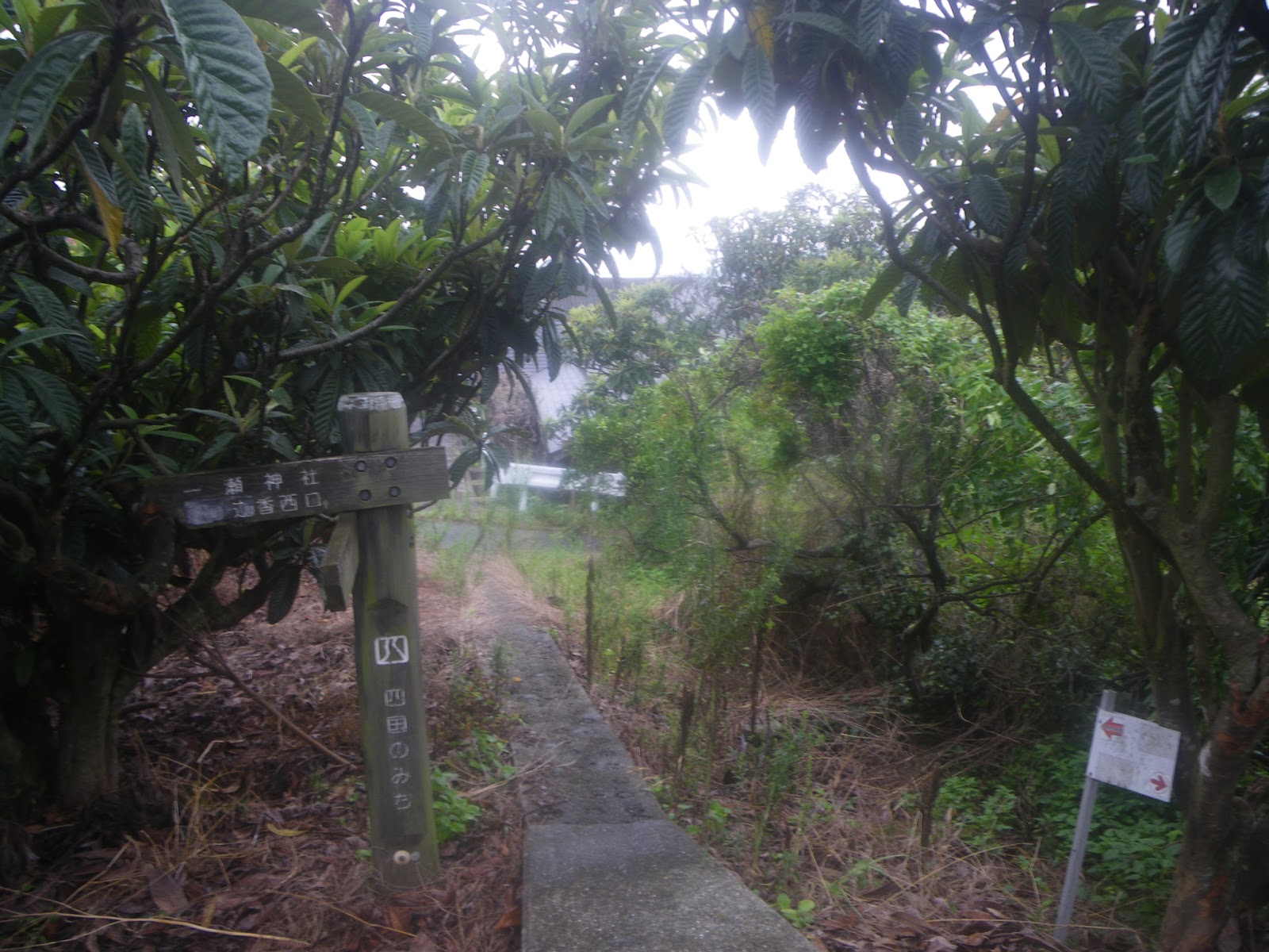 根香寺から香西口へと下る道筋をチェックする。と、根香寺の近くから国土地理院地図にお山を東へと下るルートが描かれている。お寺の山門を出て舗装された道を少し下ると、「四国のみち」の指導標があり、そこに「一瀬神社2.5km 香西口4.4km」とあり、「遍路道」のタグもついている。下山口はあっけなく見つかった。
