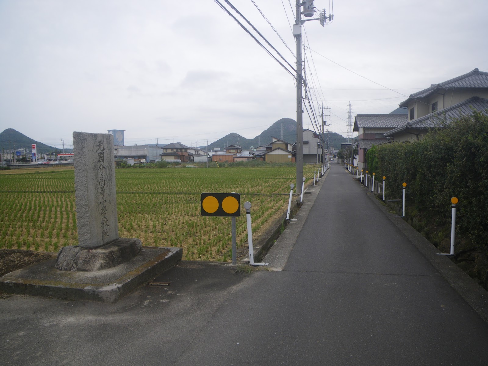 古い資料に拠れば、ルート目安となる標石は琴平電鉄長尾線歩行者踏切を渡ったところにあるとのこと。成り行きで道を進み右折・左折を繰り返し線路脇の道筋に出る。道を東に進み琴電の歩行者踏切を渡ると標石があった。